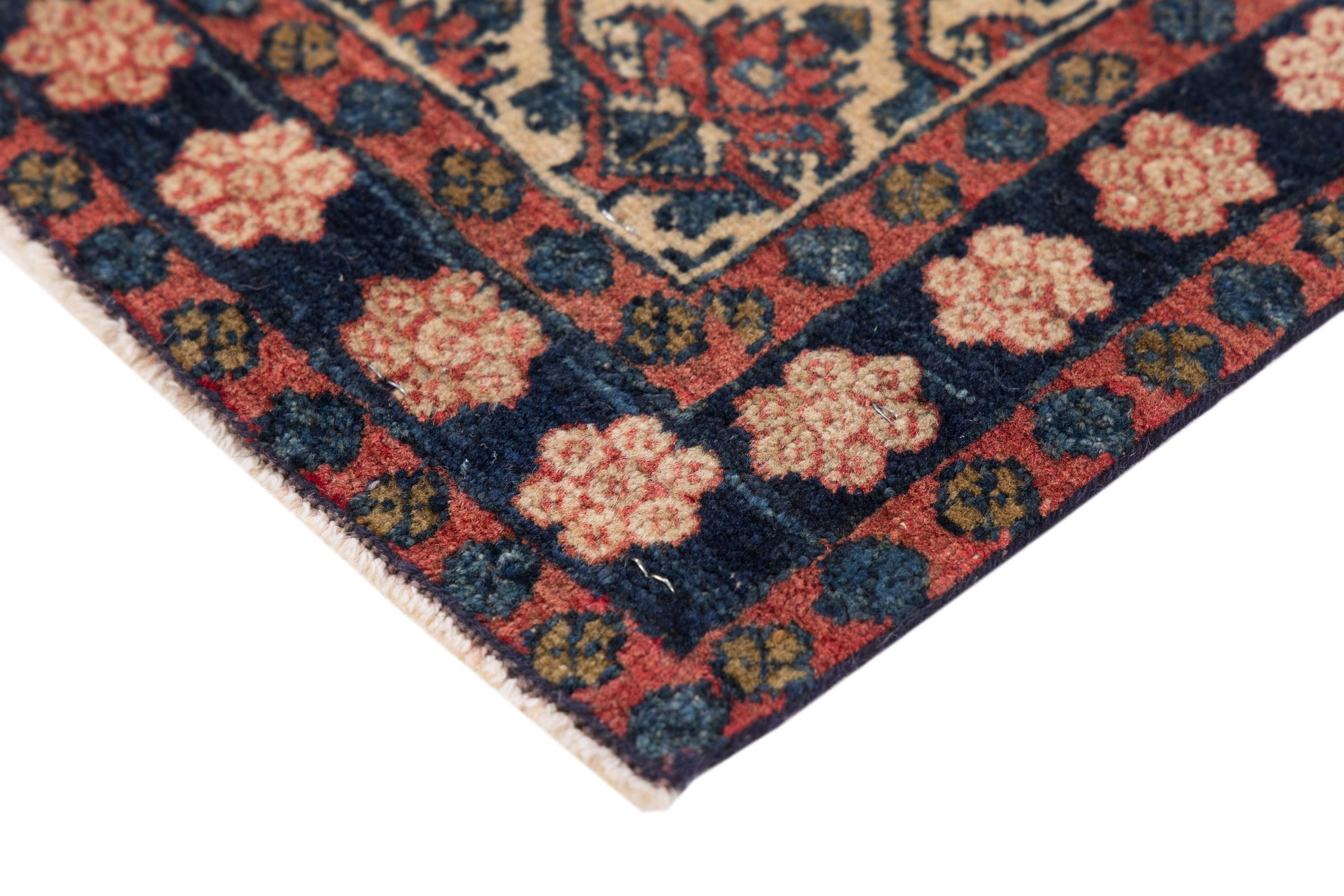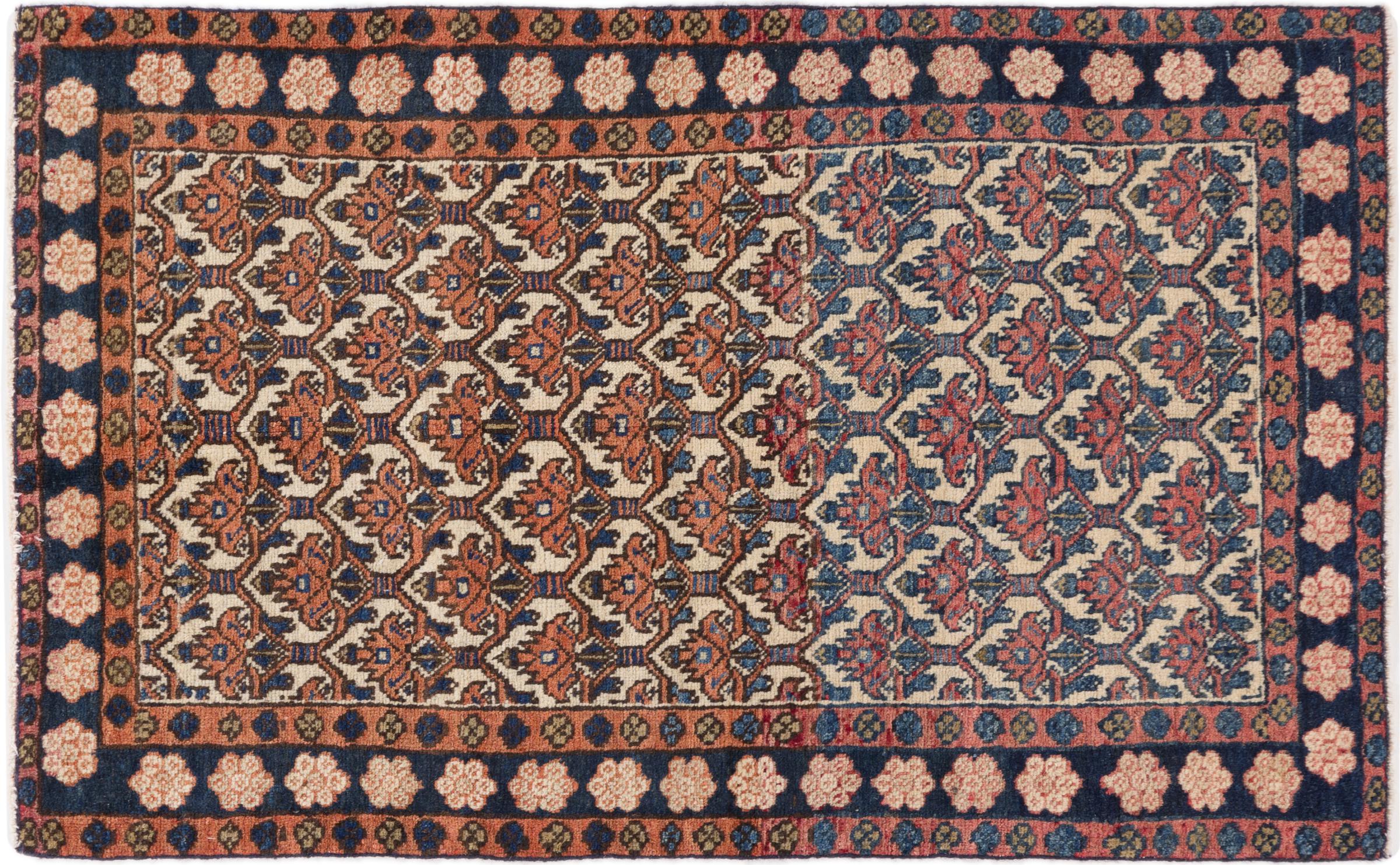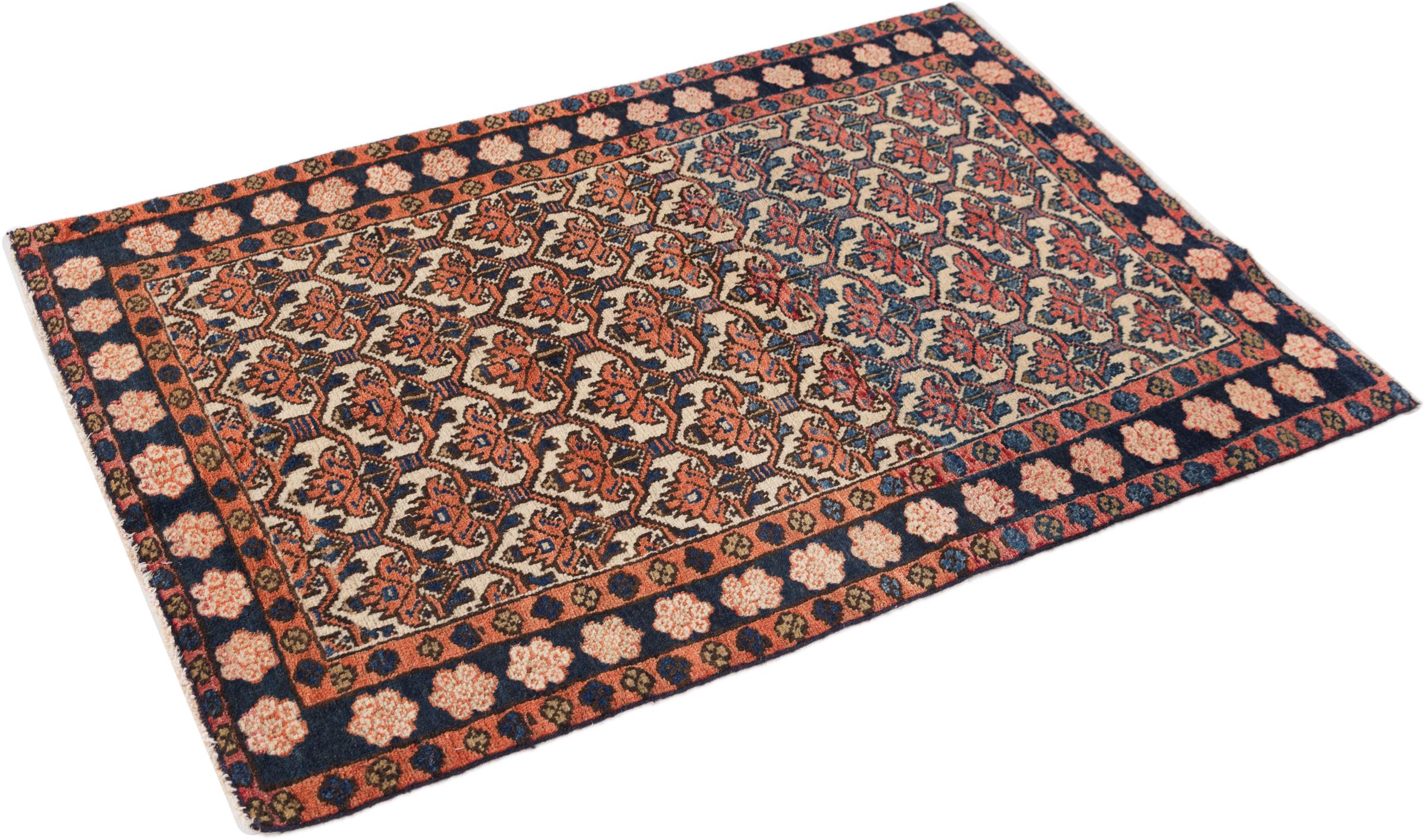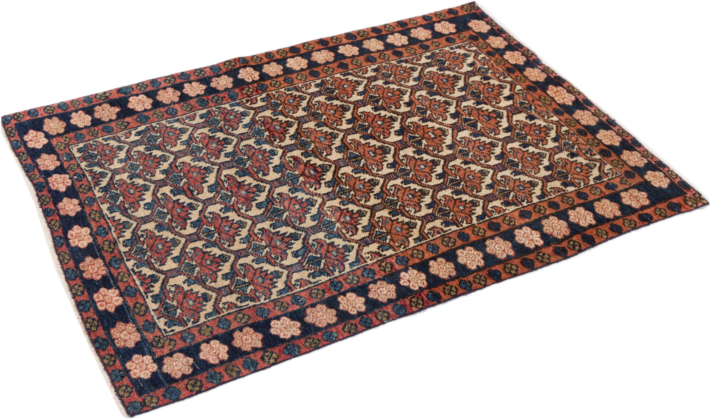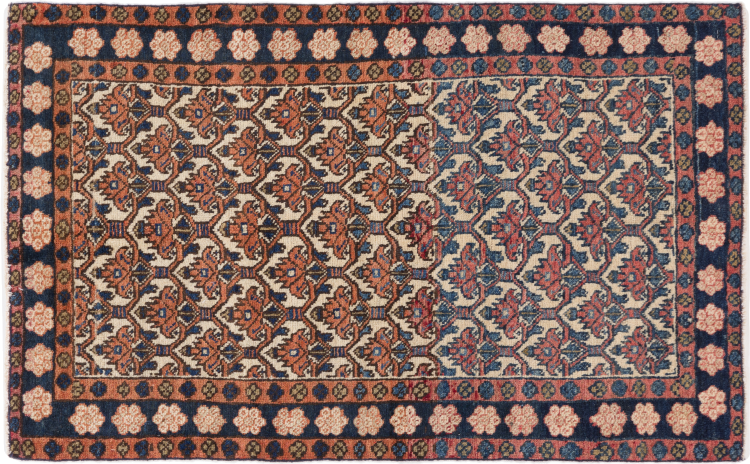 Nr.dywanu: 296243002283 Wielkość: 104x63 cm Grubość: ok. 10 mm Gęstość tkania: 128 000 - 160 000 / m² Przetwarzanie: Ręcznie tkane Włosie: Wełna ręcznie przędzona Osnowa: Bawełna Pochodzenie: Persja / Iran Wiek: stare/antyczne, starsze niż 50 lat Waga: ok. 2 kg Ilość w magazynie: Unikalny - Tylko 1 na składzie