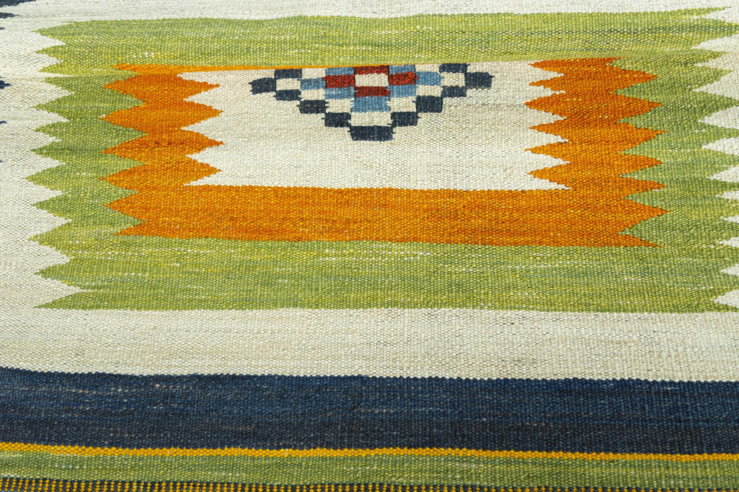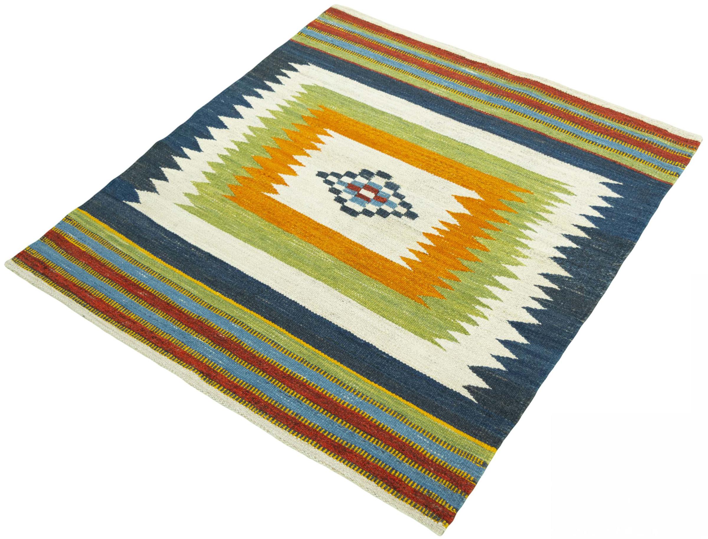 Ten dywan został wykonany ręcznie na krosnach jako płaski splot. Flatweave to termin używany do opisu dywanów, które nie mają kupki. Jak obiecuje nazwa, te dywany są tkane i nie splatane. W ten sposób powstaje płaski dywan o ustrukturyzowanej powierzchni. Płaskie fale nie są tak miękkie i zazwyczaj cieńsze niż dywany węzełkowe. Jednocześnie są one znacznie mniej skomplikowane w produkcji i zazwyczaj mogą być układane z obu stron (z przodu i z tyłu). Ich wzory są zazwyczaj geometryczne, co jest uwarunkowane tkaniną.