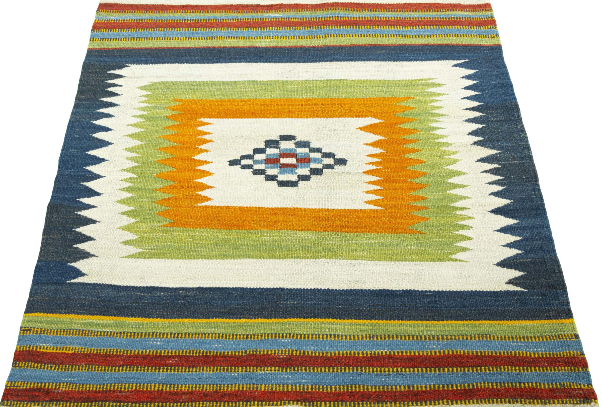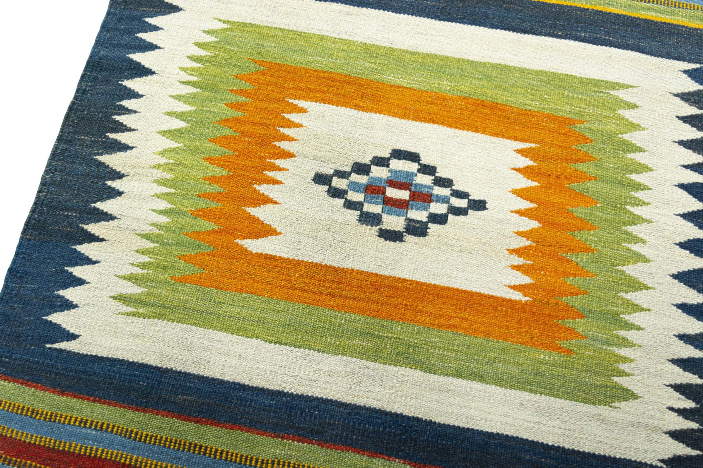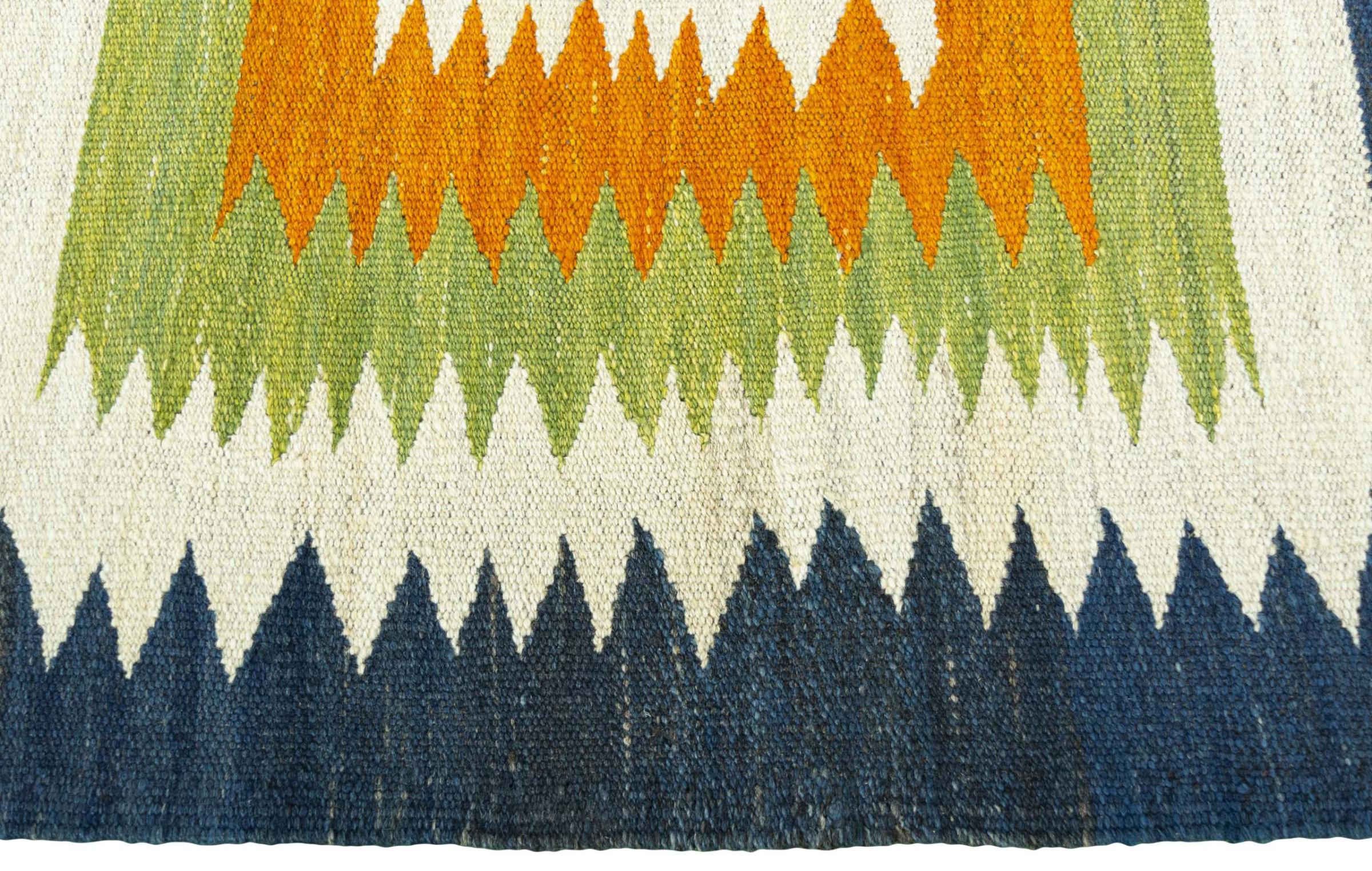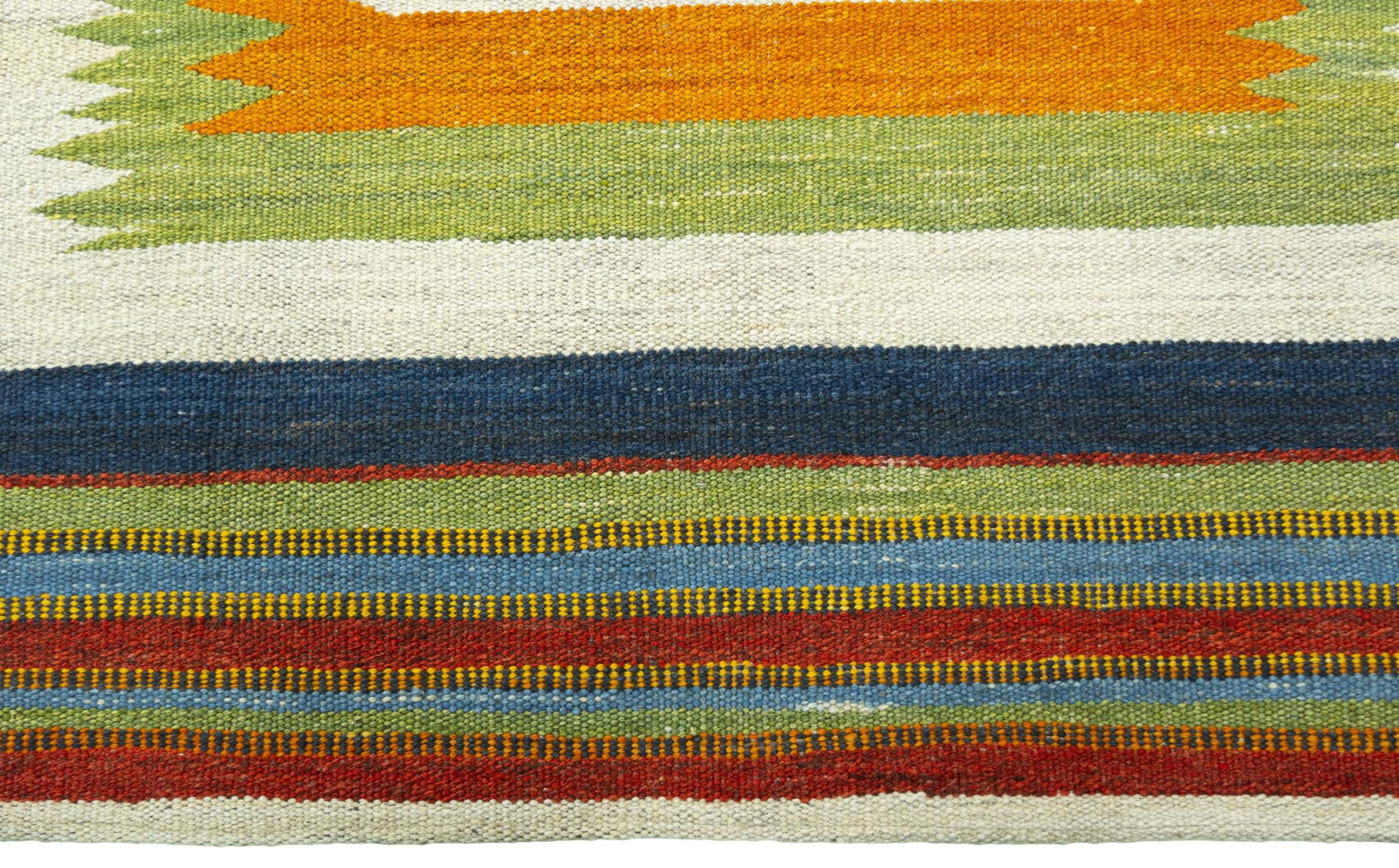 Ten kilim Eylisian to szczególnie wysokiej jakości, nowoczesny kilim o płaskim splocie. Ręcznie przędziona/naturalna wełna została ręcznie tkana według współczesnego wzornictwa, przy użyciu tradycyjnej perskiej techniki. Jego solidna i trwała jakość sprawia, że ​​jest to popularny, nowoczesny i ponadczasowy element przyciągający wzrok w Twoim domu.