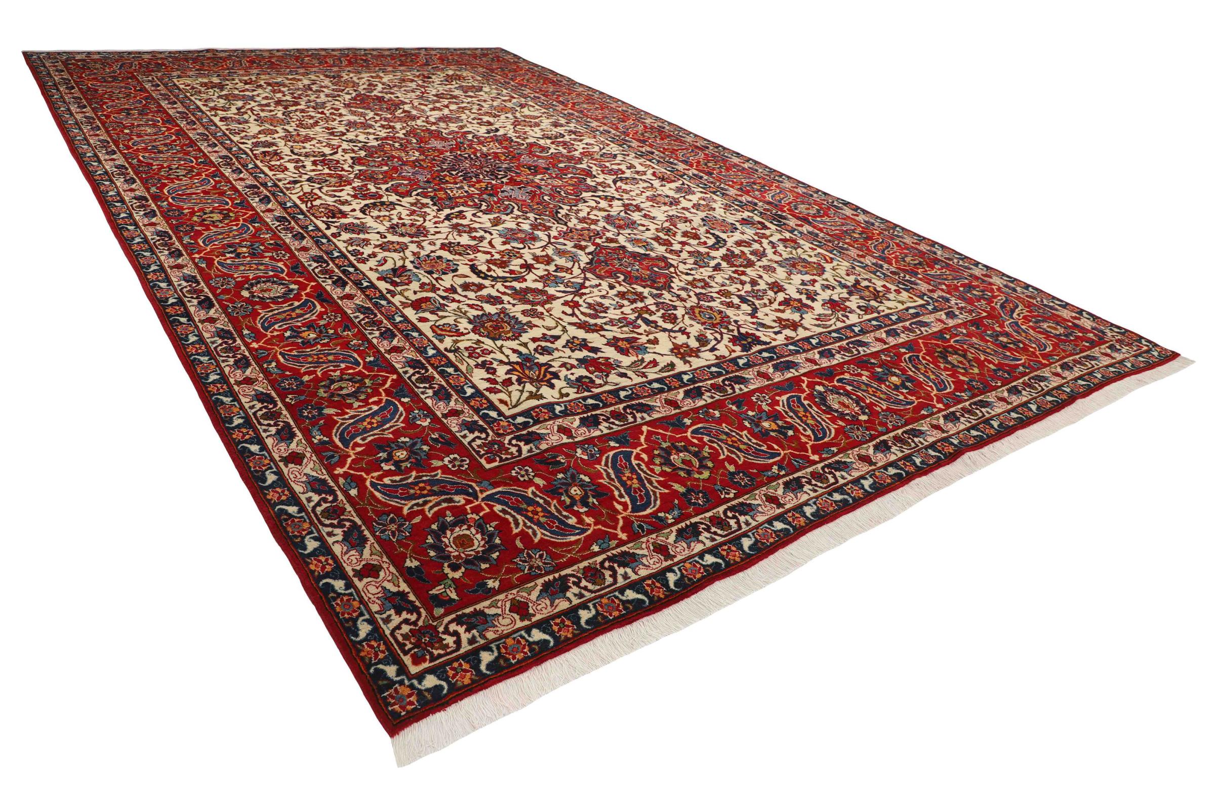 Nr.dywanu: 299805007305890 Wielkość: 539x349 cm Grubość: ok. 6 mm Gęstość tkania: 900 000 / m² Przetwarzanie: Ręcznie tkane Włosie: Wełna z jedwabiem Osnowa: Bawełna Pochodzenie: Persja / Iran Wiek: nowe Waga: ok. 56 kg Ilość w magazynie: Unikalny - Tylko 1 na składzie