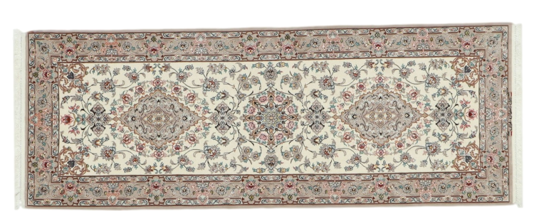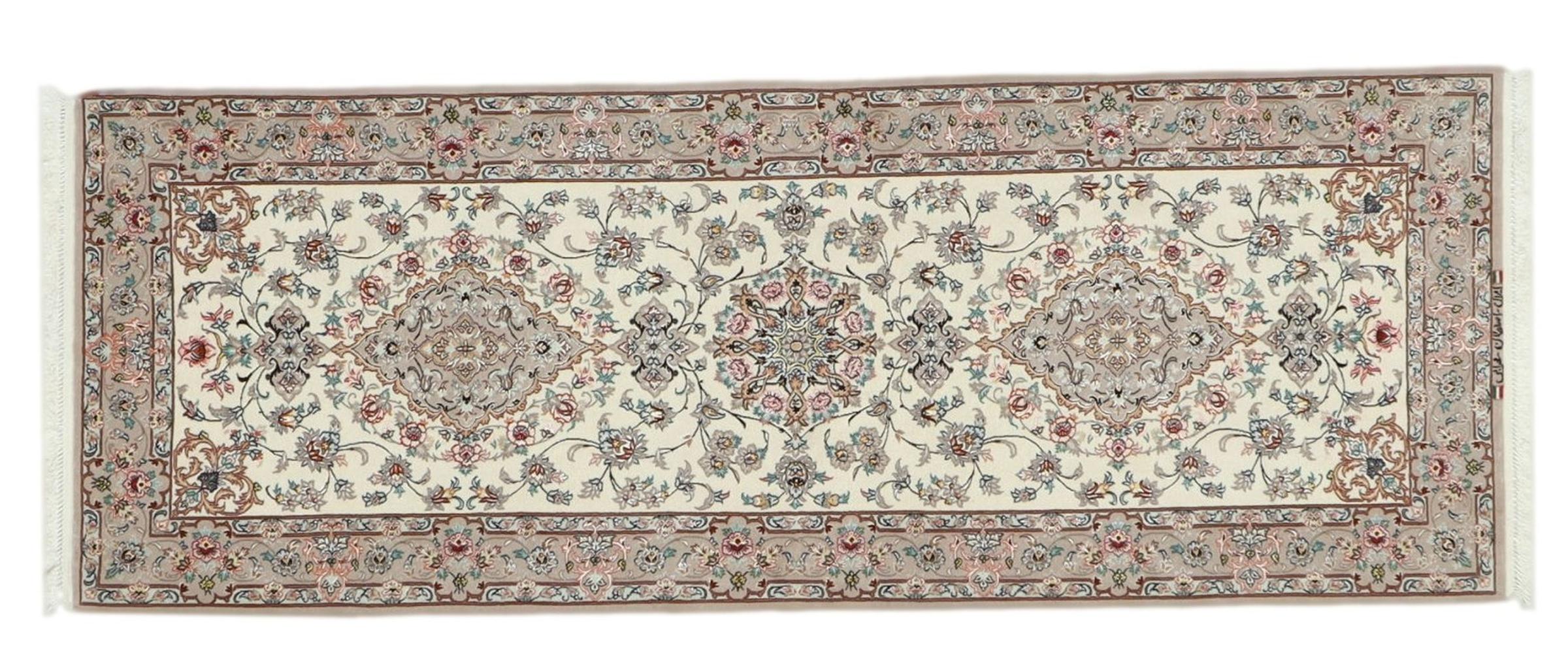 Nr.dywanu: 309075008932026 Wielkość: 219x82 cm Grubość: ok. 6 mm Gęstość tkania: 810 000 / m² Przetwarzanie: Ręcznie tkane Włosie: Wełna z jedwabiem Osnowa: Jewab Pochodzenie: Persja / Iran Wiek: nowe Waga: ok. 5 kg Ilość w magazynie: Unikalny - Tylko 1 na składzie