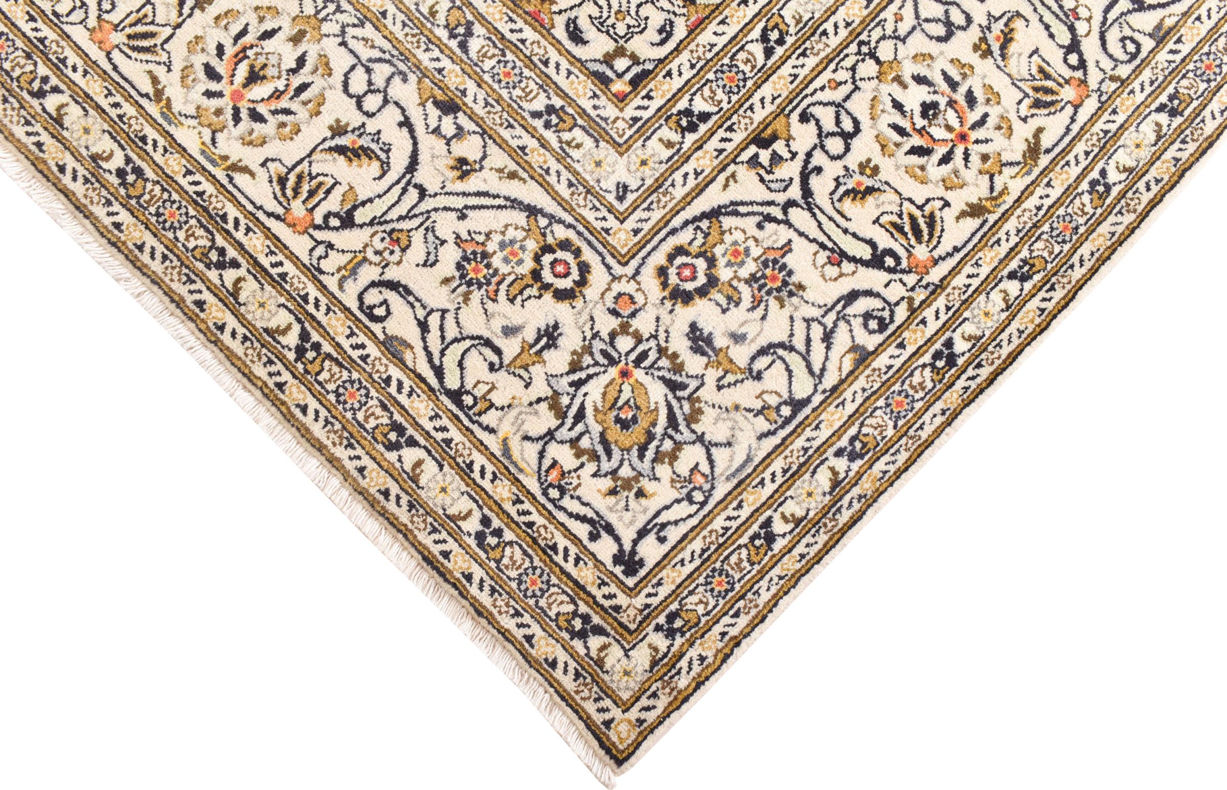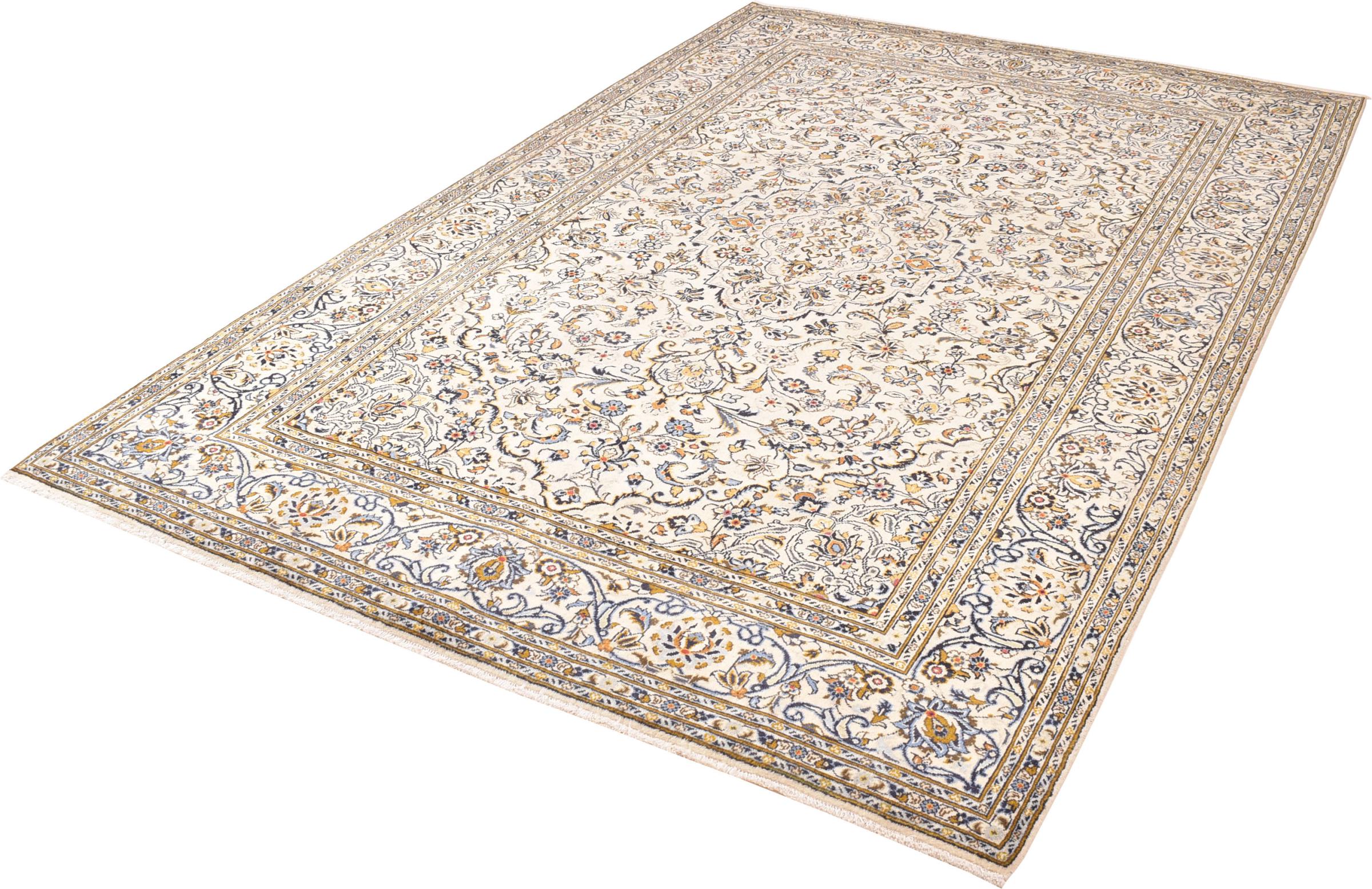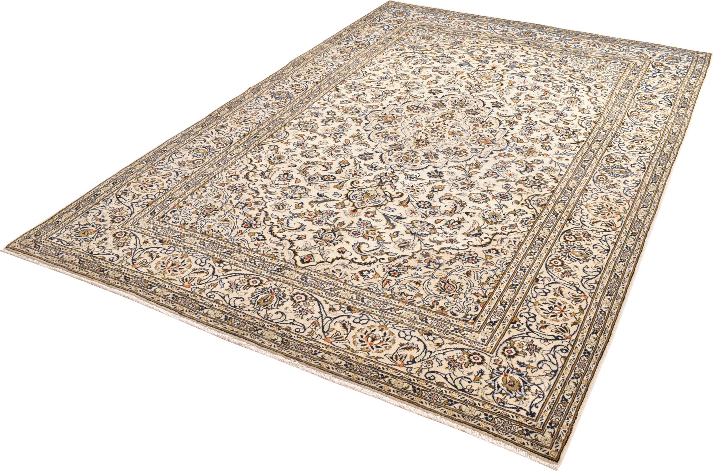 Ten dywan z Kashan (Keshan) ma bardzo tradycyjny i typowy perski wzór z pięknymi ornamentami. Dywany Kashan cieszą się dużą popularnością ze względu na ich wyjątkowo elegancki design. Dywany te pochodzą z Kaszanu, miasta leżącego na starożytnym Jedwabnym Szlaku. Ten dywan został ręcznie tkany z wysokiej jakości wełny owczej i będzie jedyną w swoim rodzaju atrakcją w Twoim domu.