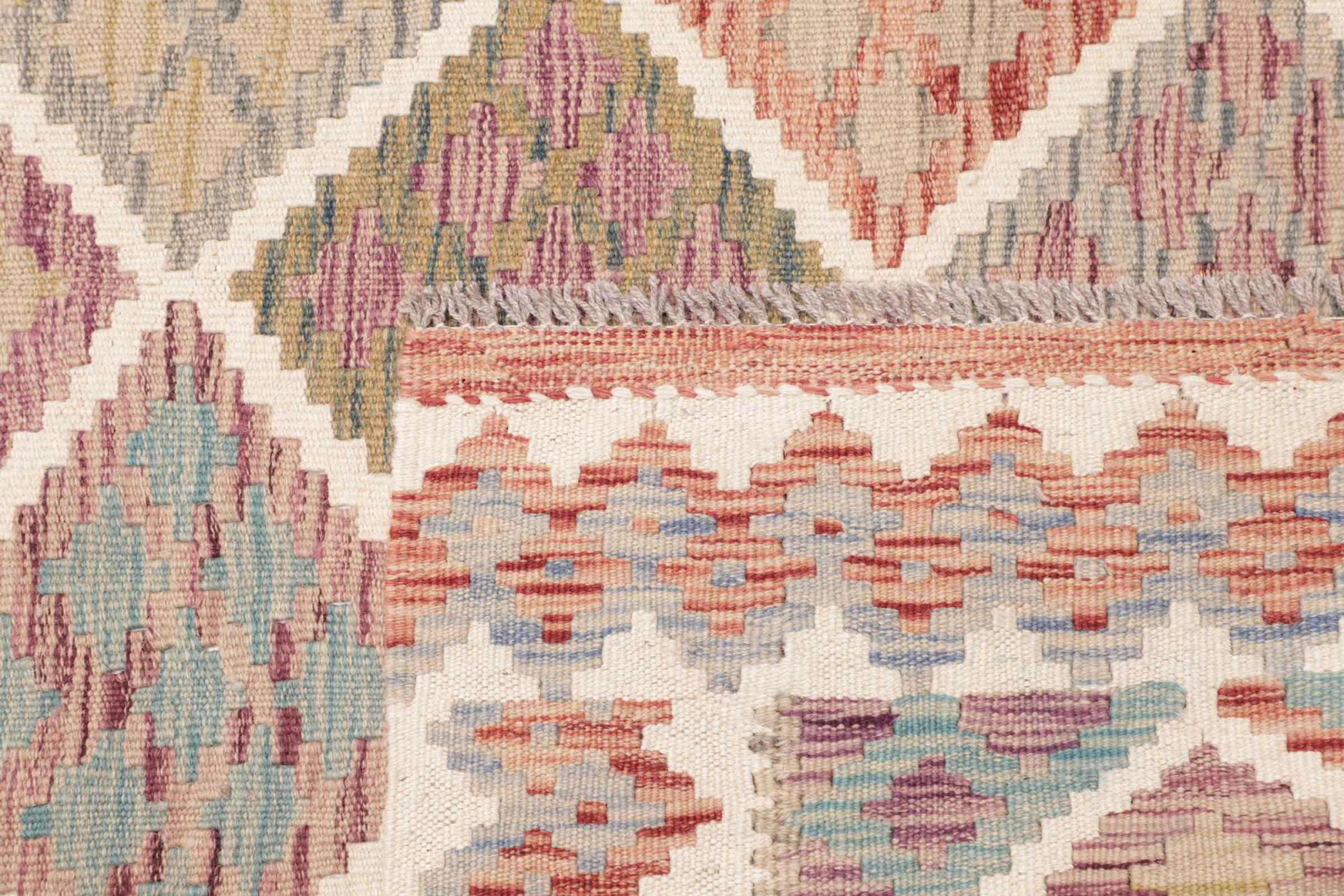 Ten dywan został wykonany ręcznie na krosnach jako płaski splot. Flatweave to termin używany do opisu dywanów, które nie mają kupki. Jak obiecuje nazwa, te dywany są tkane i nie splatane. W ten sposób powstaje płaski dywan o ustrukturyzowanej powierzchni. Płaskie fale nie są tak miękkie i zazwyczaj cieńsze niż dywany węzełkowe. Jednocześnie są one znacznie mniej skomplikowane w produkcji i zazwyczaj mogą być układane z obu stron (z przodu i z tyłu). Ich wzory są zazwyczaj geometryczne, co jest uwarunkowane tkaniną.