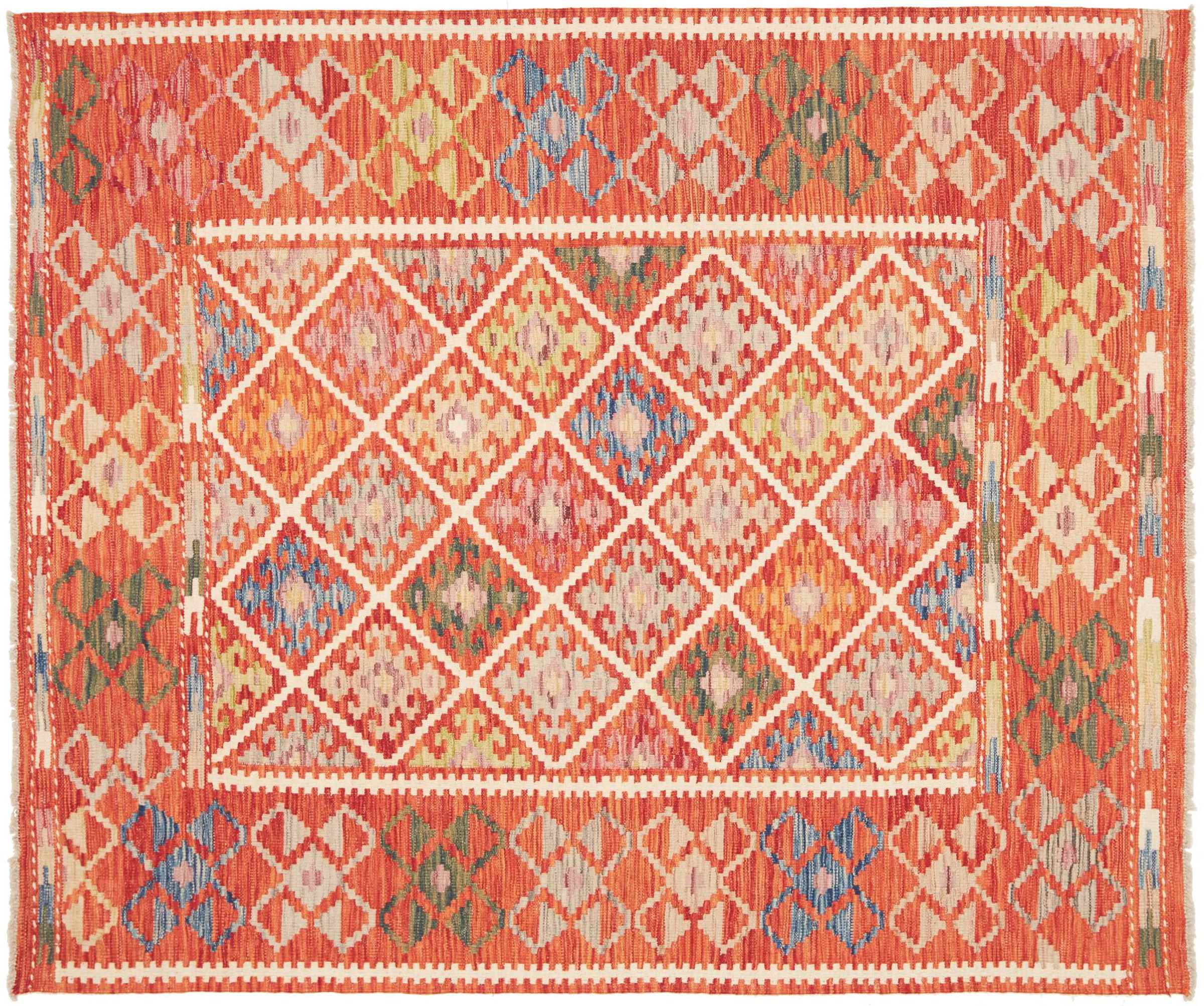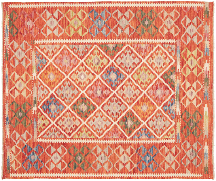 Nr.dywanu: 311223007812195 Wielkość: 192x162 cm Grubość: ok. 3 mm Przetwarzanie: Ręcznie tkane Włosie: Wełna ręcznie przędzona Osnowa: Wełna Pochodzenie: Afganistan Wiek: nowe Waga: ok. 5 kg Ilość w magazynie: Unikalny - Tylko 1 na składzie