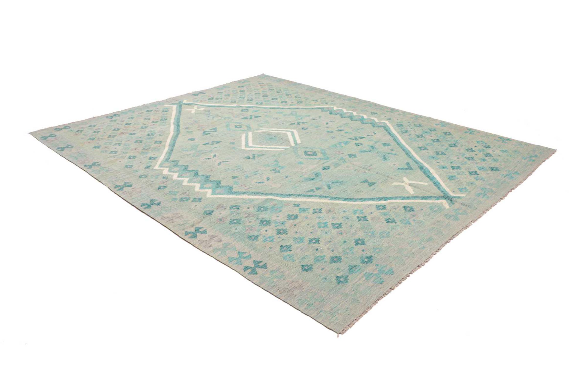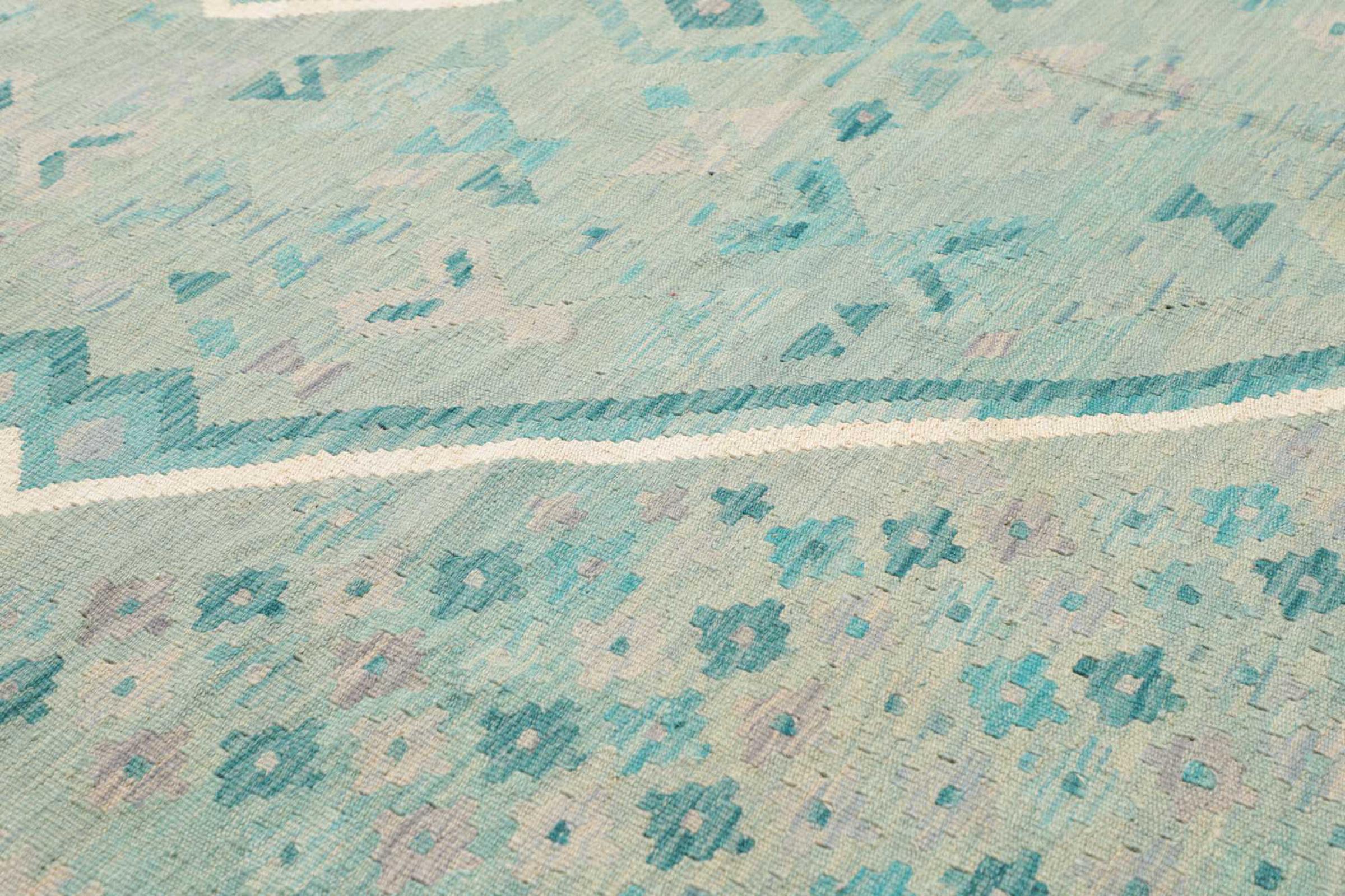 Ten dywan został wykonany ręcznie na krosnach jako płaski splot. Flatweave to termin używany do opisu dywanów, które nie mają kupki. Jak obiecuje nazwa, te dywany są tkane i nie splatane. W ten sposób powstaje płaski dywan o ustrukturyzowanej powierzchni. Płaskie fale nie są tak miękkie i zazwyczaj cieńsze niż dywany węzełkowe. Jednocześnie są one znacznie mniej skomplikowane w produkcji i zazwyczaj mogą być układane z obu stron (z przodu i z tyłu). Ich wzory są zazwyczaj geometryczne, co jest uwarunkowane tkaniną.
