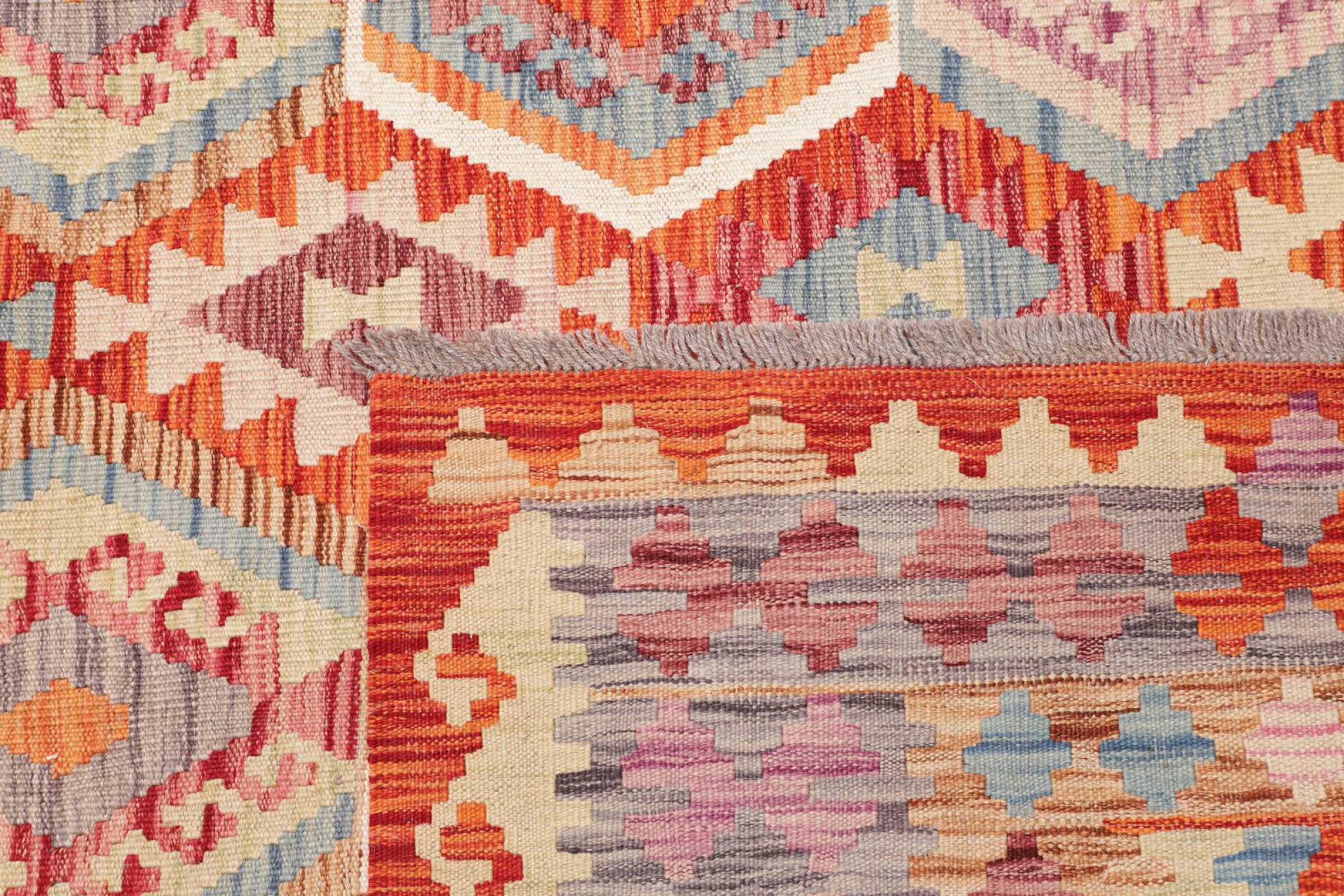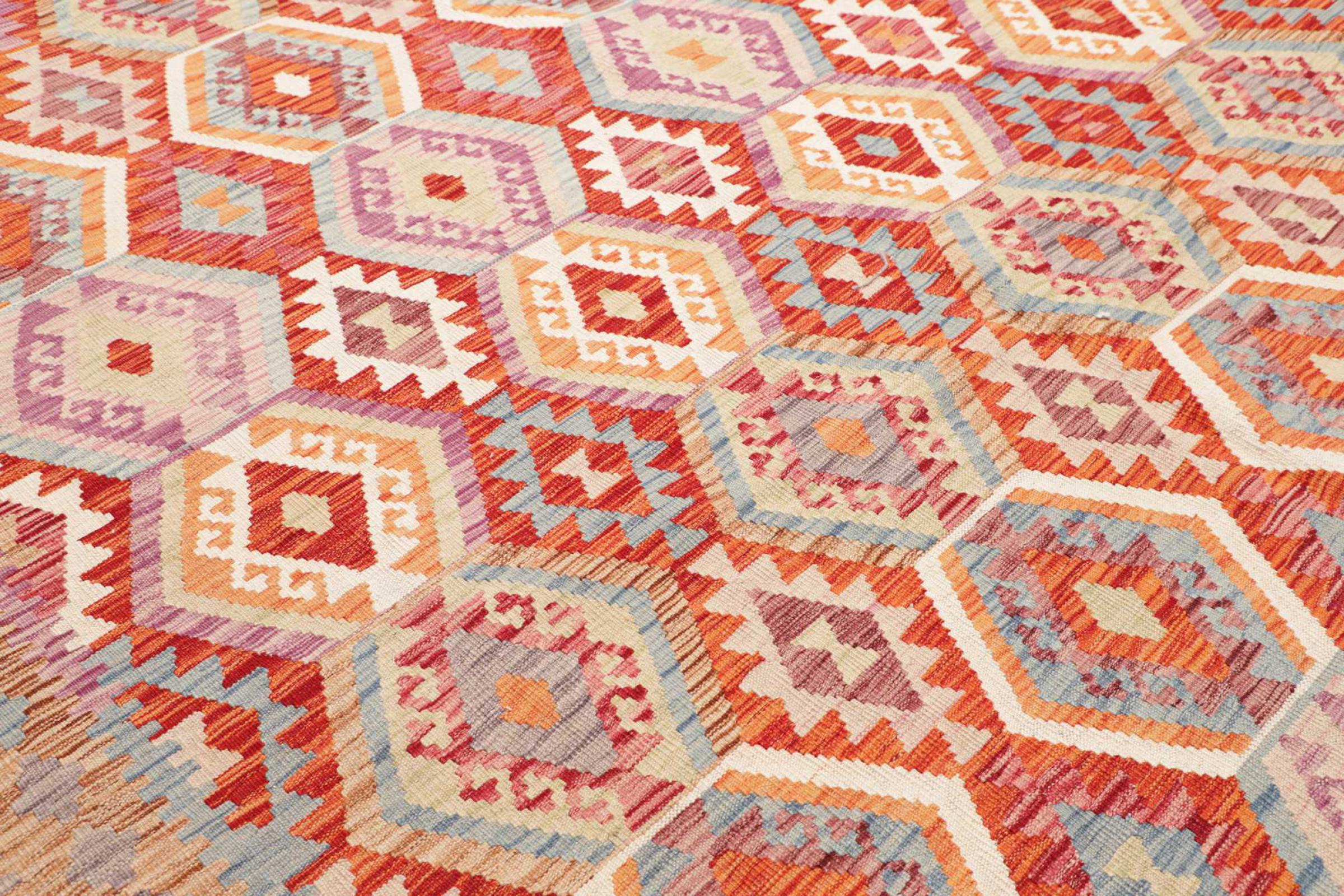 Ten dywan został wykonany ręcznie na krosnach jako płaski splot. Flatweave to termin używany do opisu dywanów, które nie mają kupki. Jak obiecuje nazwa, te dywany są tkane i nie splatane. W ten sposób powstaje płaski dywan o ustrukturyzowanej powierzchni. Płaskie fale nie są tak miękkie i zazwyczaj cieńsze niż dywany węzełkowe. Jednocześnie są one znacznie mniej skomplikowane w produkcji i zazwyczaj mogą być układane z obu stron (z przodu i z tyłu). Ich wzory są zazwyczaj geometryczne, co jest uwarunkowane tkaniną.