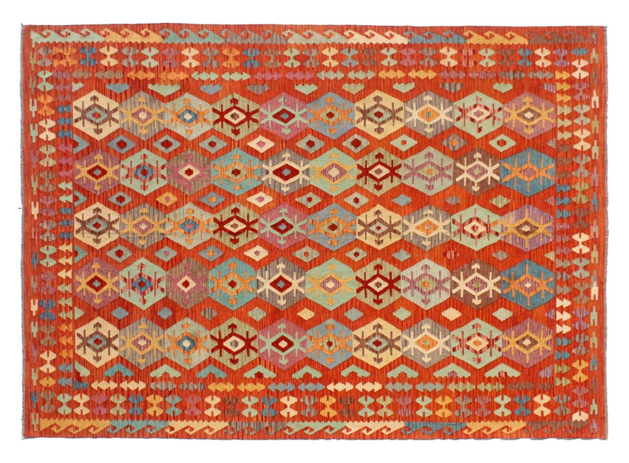 Ten ręcznie tkany kilim afgański jest piękny dzięki wielopłaszczyznowym kolorom i charakterystycznemu wzorowi. Została utkana ręcznie w Afganistanie ze 100% owczej wełny. Jest niewątpliwie bardziej wytrzymały i trwalszy niż dywany tkane maszynowo. Ponadto kilim ten ma swój własny charakter. Wyjątkowy element dla Ciebie i Twojego domu, którego już nigdy nie znajdziesz.
