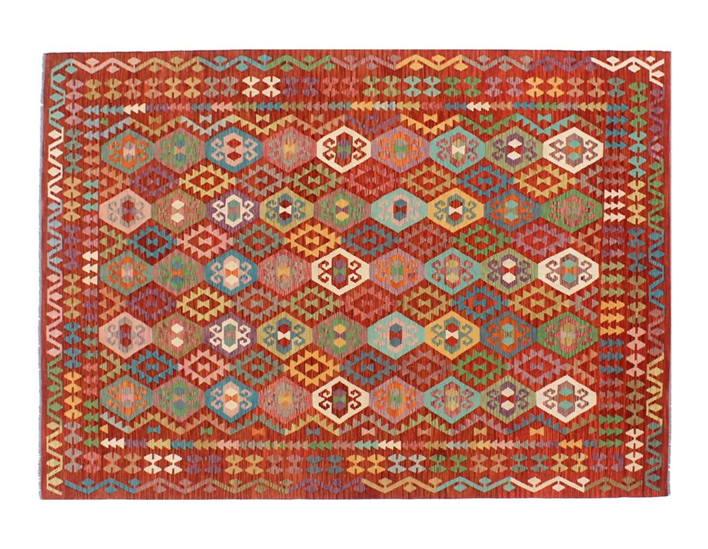 Ten ręcznie tkany kilim afgański jest piękny dzięki wielopłaszczyznowym kolorom i charakterystycznemu wzorowi. Została utkana ręcznie w Afganistanie ze 100% owczej wełny. Jest niewątpliwie bardziej wytrzymały i trwalszy niż dywany tkane maszynowo. Ponadto kilim ten ma swój własny charakter. Wyjątkowy element dla Ciebie i Twojego domu, którego już nigdy nie znajdziesz.