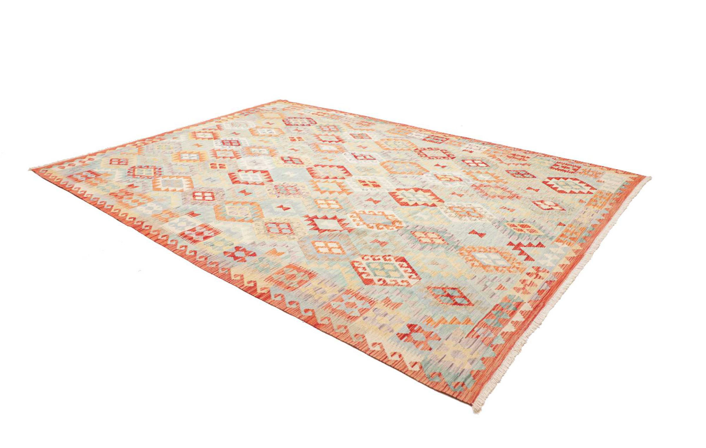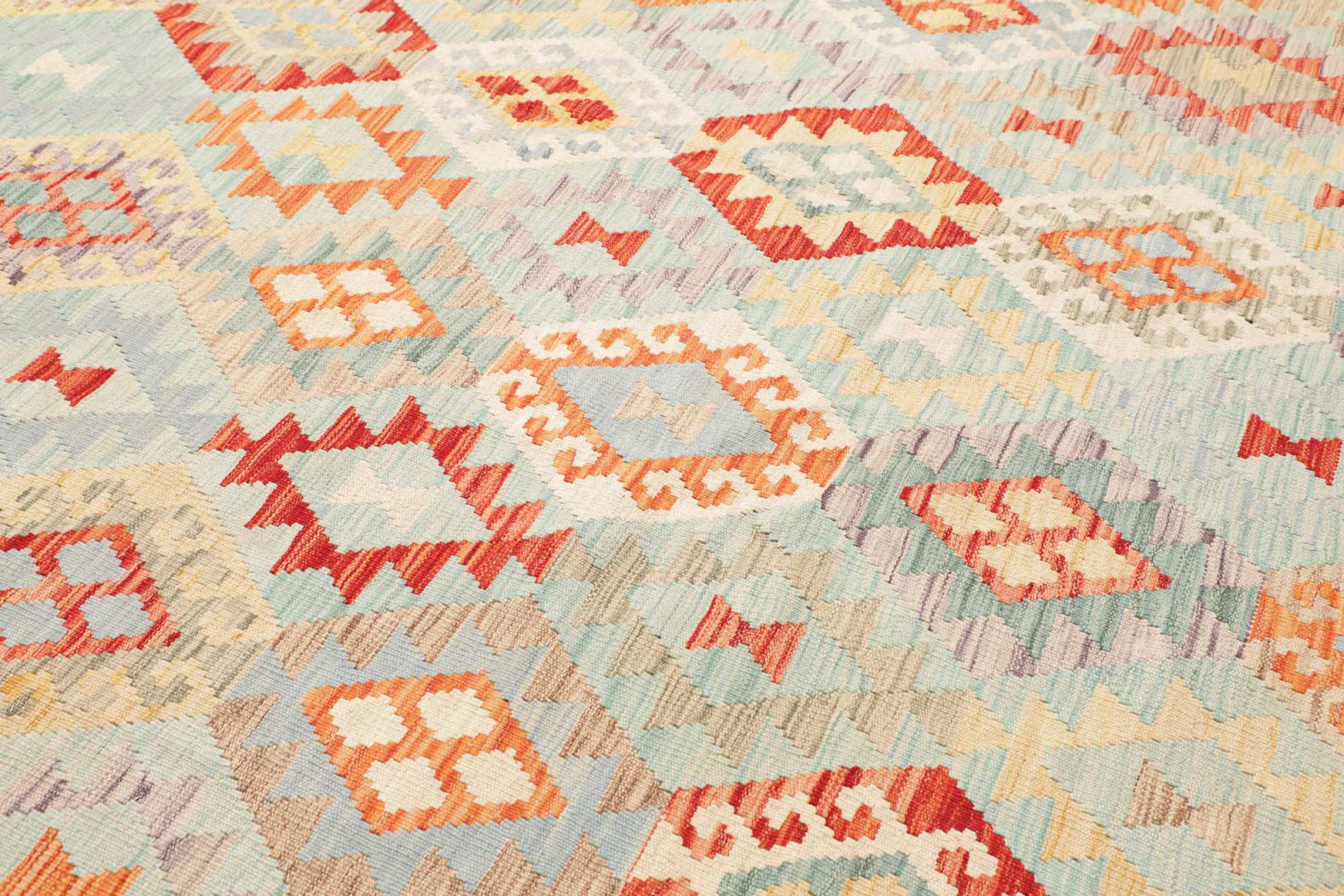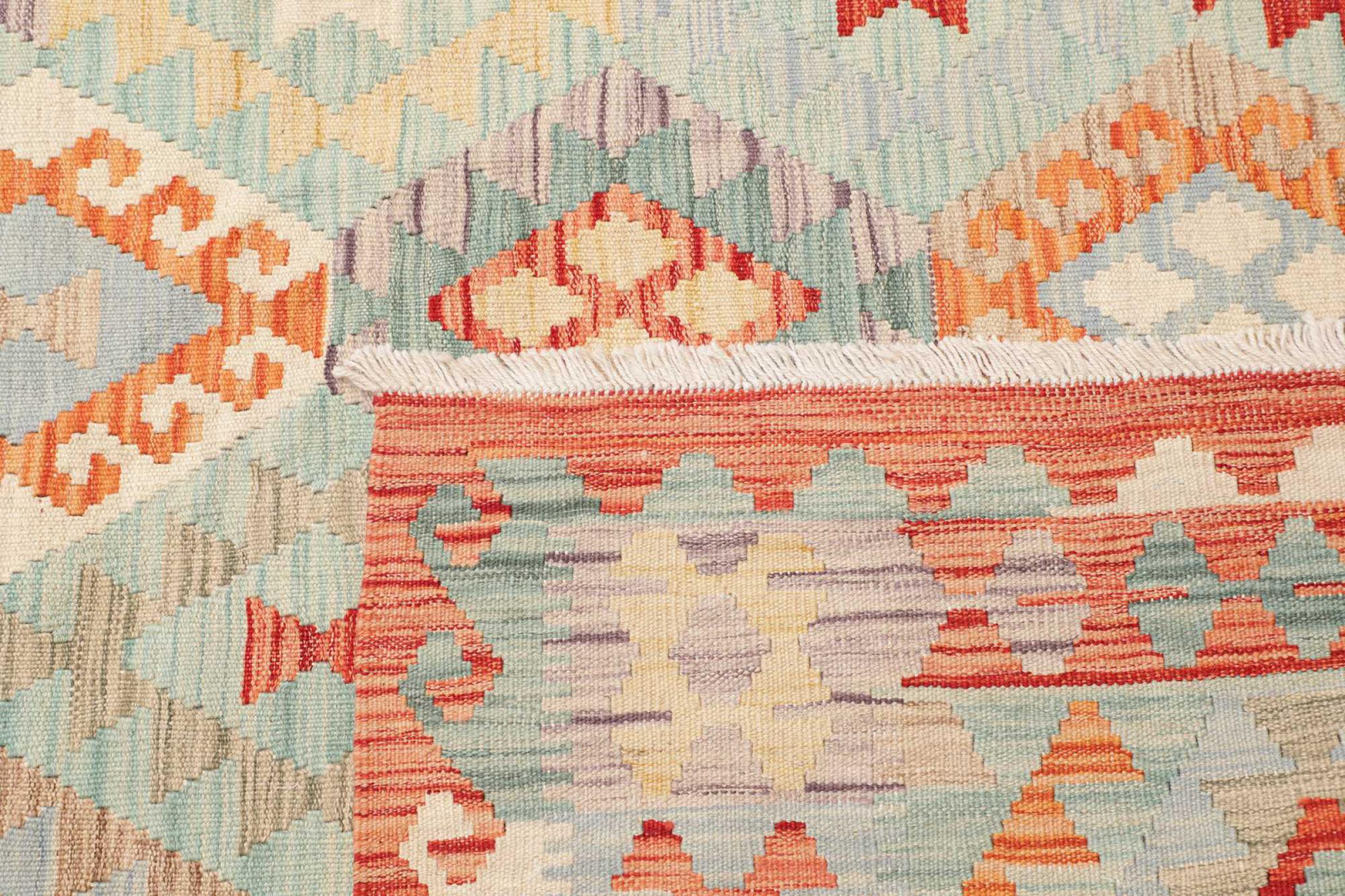 Ten dywan został wykonany ręcznie na krosnach jako płaski splot. Flatweave to termin używany do opisu dywanów, które nie mają kupki. Jak obiecuje nazwa, te dywany są tkane i nie splatane. W ten sposób powstaje płaski dywan o ustrukturyzowanej powierzchni. Płaskie fale nie są tak miękkie i zazwyczaj cieńsze niż dywany węzełkowe. Jednocześnie są one znacznie mniej skomplikowane w produkcji i zazwyczaj mogą być układane z obu stron (z przodu i z tyłu). Ich wzory są zazwyczaj geometryczne, co jest uwarunkowane tkaniną.