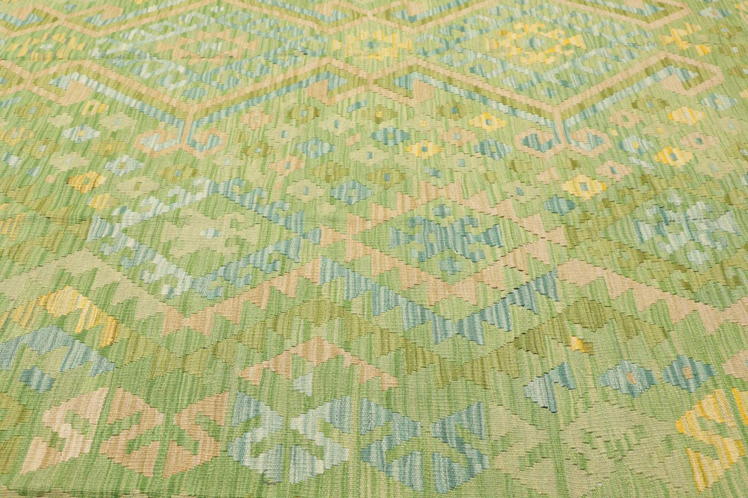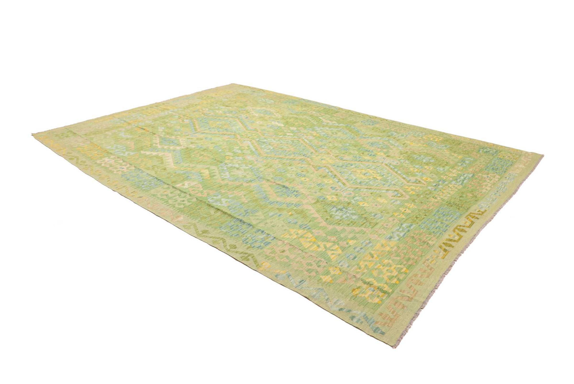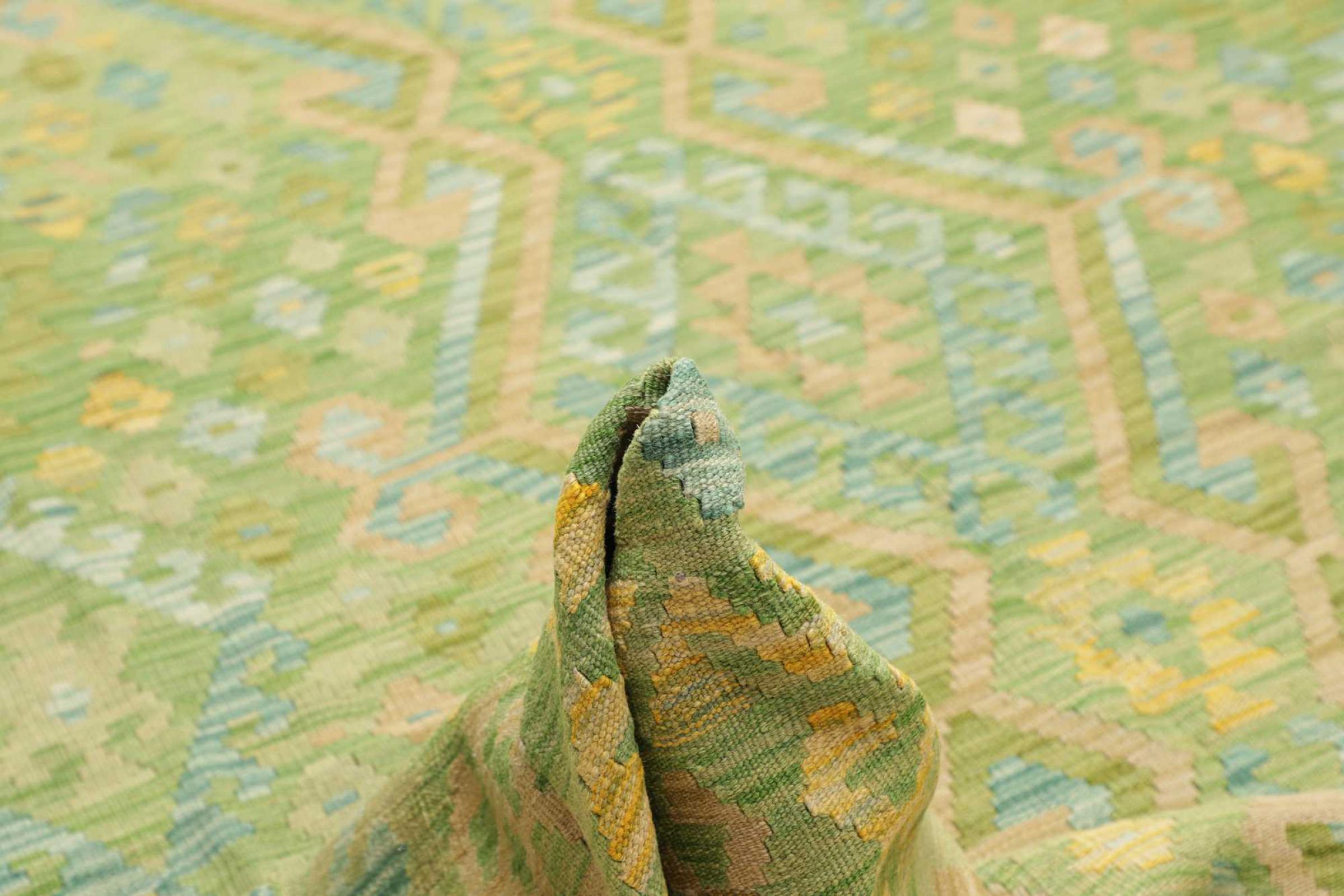 Ten dywan został wykonany ręcznie na krosnach jako płaski splot. Flatweave to termin używany do opisu dywanów, które nie mają kupki. Jak obiecuje nazwa, te dywany są tkane i nie splatane. W ten sposób powstaje płaski dywan o ustrukturyzowanej powierzchni. Płaskie fale nie są tak miękkie i zazwyczaj cieńsze niż dywany węzełkowe. Jednocześnie są one znacznie mniej skomplikowane w produkcji i zazwyczaj mogą być układane z obu stron (z przodu i z tyłu). Ich wzory są zazwyczaj geometryczne, co jest uwarunkowane tkaniną.