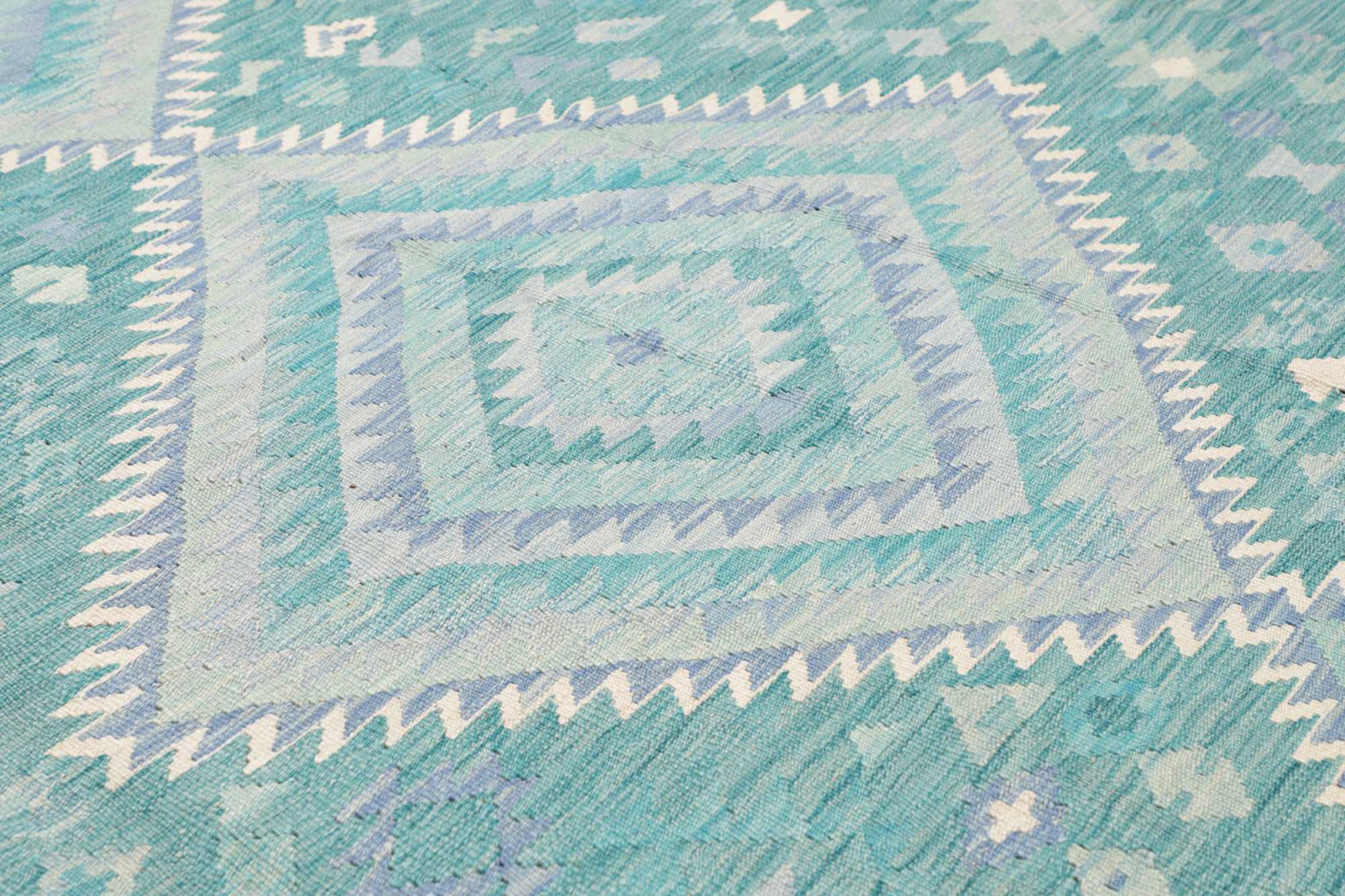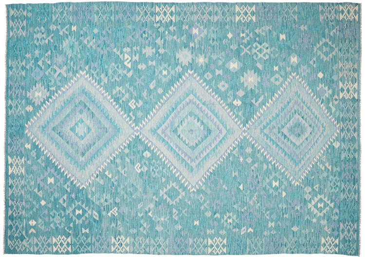 Ten dywan został wykonany ręcznie na krosnach jako płaski splot. Flatweave to termin używany do opisu dywanów, które nie mają kupki. Jak obiecuje nazwa, te dywany są tkane i nie splatane. W ten sposób powstaje płaski dywan o ustrukturyzowanej powierzchni. Płaskie fale nie są tak miękkie i zazwyczaj cieńsze niż dywany węzełkowe. Jednocześnie są one znacznie mniej skomplikowane w produkcji i zazwyczaj mogą być układane z obu stron (z przodu i z tyłu). Ich wzory są zazwyczaj geometryczne, co jest uwarunkowane tkaniną.
