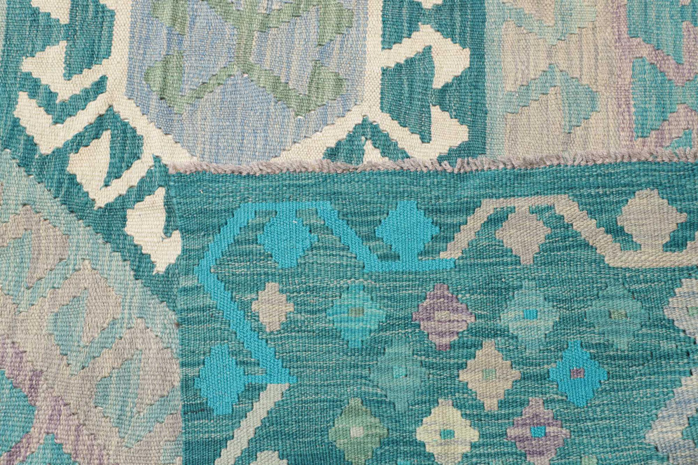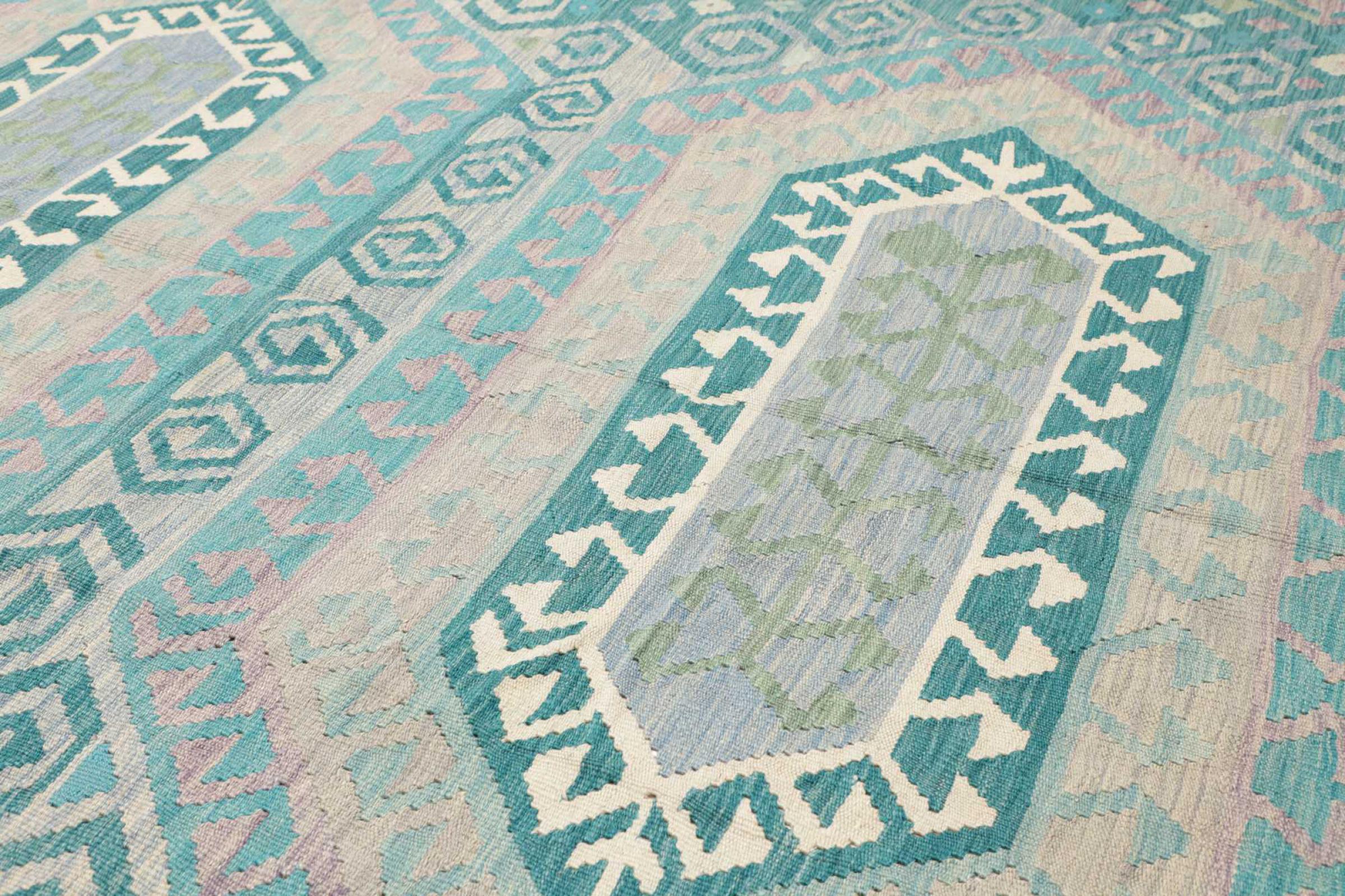 Ten dywan został wykonany ręcznie na krosnach jako płaski splot. Flatweave to termin używany do opisu dywanów, które nie mają kupki. Jak obiecuje nazwa, te dywany są tkane i nie splatane. W ten sposób powstaje płaski dywan o ustrukturyzowanej powierzchni. Płaskie fale nie są tak miękkie i zazwyczaj cieńsze niż dywany węzełkowe. Jednocześnie są one znacznie mniej skomplikowane w produkcji i zazwyczaj mogą być układane z obu stron (z przodu i z tyłu). Ich wzory są zazwyczaj geometryczne, co jest uwarunkowane tkaniną.