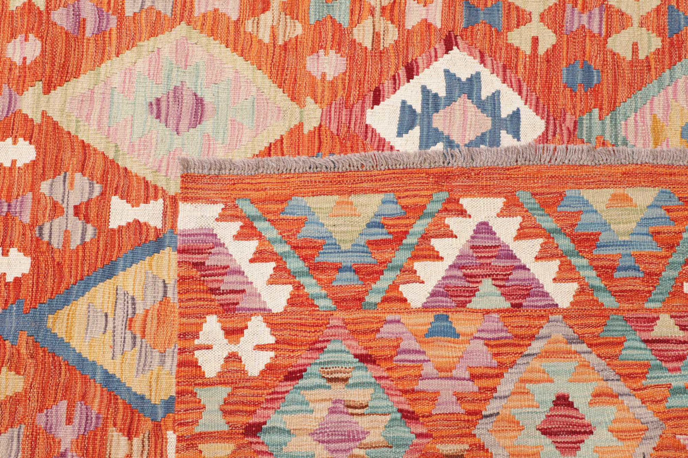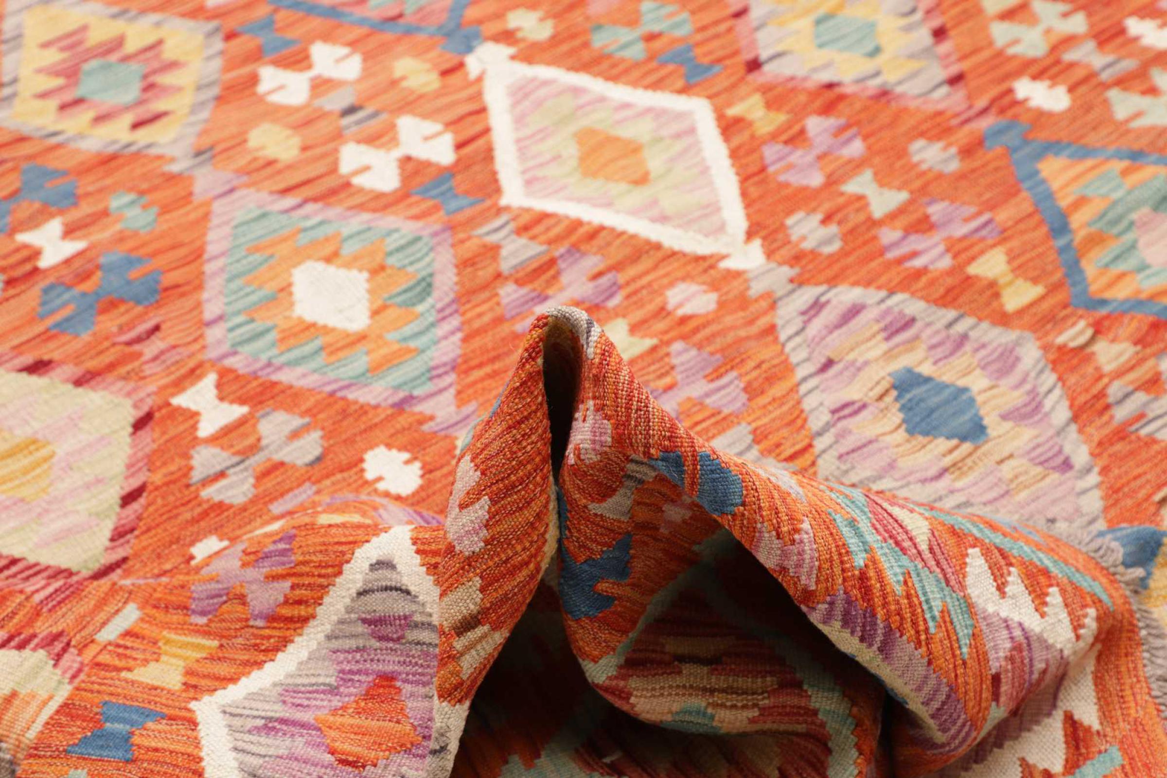 Ten dywan został wykonany ręcznie na krosnach jako płaski splot. Flatweave to termin używany do opisu dywanów, które nie mają kupki. Jak obiecuje nazwa, te dywany są tkane i nie splatane. W ten sposób powstaje płaski dywan o ustrukturyzowanej powierzchni. Płaskie fale nie są tak miękkie i zazwyczaj cieńsze niż dywany węzełkowe. Jednocześnie są one znacznie mniej skomplikowane w produkcji i zazwyczaj mogą być układane z obu stron (z przodu i z tyłu). Ich wzory są zazwyczaj geometryczne, co jest uwarunkowane tkaniną.