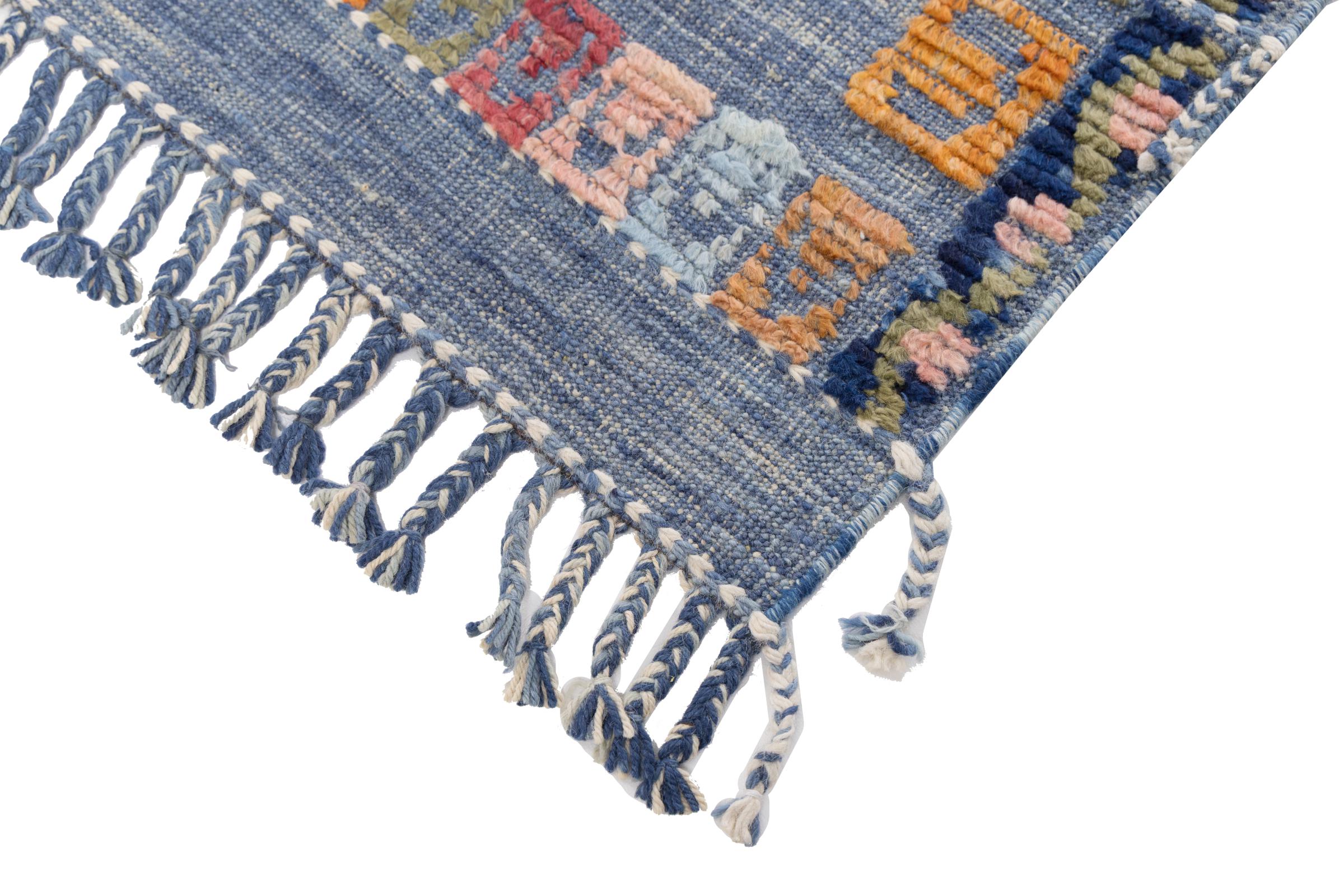 Ten dywan został wykonany ręcznie na krosnach jako płaski splot. Flatweave to termin używany do opisu dywanów, które nie mają kupki. Jak obiecuje nazwa, te dywany są tkane i nie splatane. W ten sposób powstaje płaski dywan o ustrukturyzowanej powierzchni. Płaskie fale nie są tak miękkie i zazwyczaj cieńsze niż dywany węzełkowe. Jednocześnie są one znacznie mniej skomplikowane w produkcji i zazwyczaj mogą być układane z obu stron (z przodu i z tyłu). Ich wzory są zazwyczaj geometryczne, co jest uwarunkowane tkaniną.