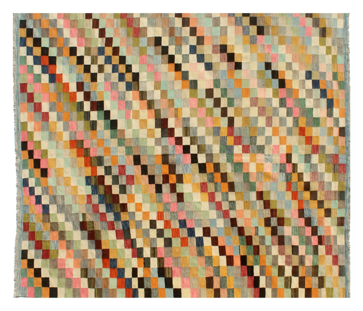 Ten dywan został wykonany ręcznie na krosnach jako płaski splot. Flatweave to termin używany do opisu dywanów, które nie mają kupki. Jak obiecuje nazwa, te dywany są tkane i nie splatane. W ten sposób powstaje płaski dywan o ustrukturyzowanej powierzchni. Płaskie fale nie są tak miękkie i zazwyczaj cieńsze niż dywany węzełkowe. Jednocześnie są one znacznie mniej skomplikowane w produkcji i zazwyczaj mogą być układane z obu stron (z przodu i z tyłu). Ich wzory są zazwyczaj geometryczne, co jest uwarunkowane tkaniną.