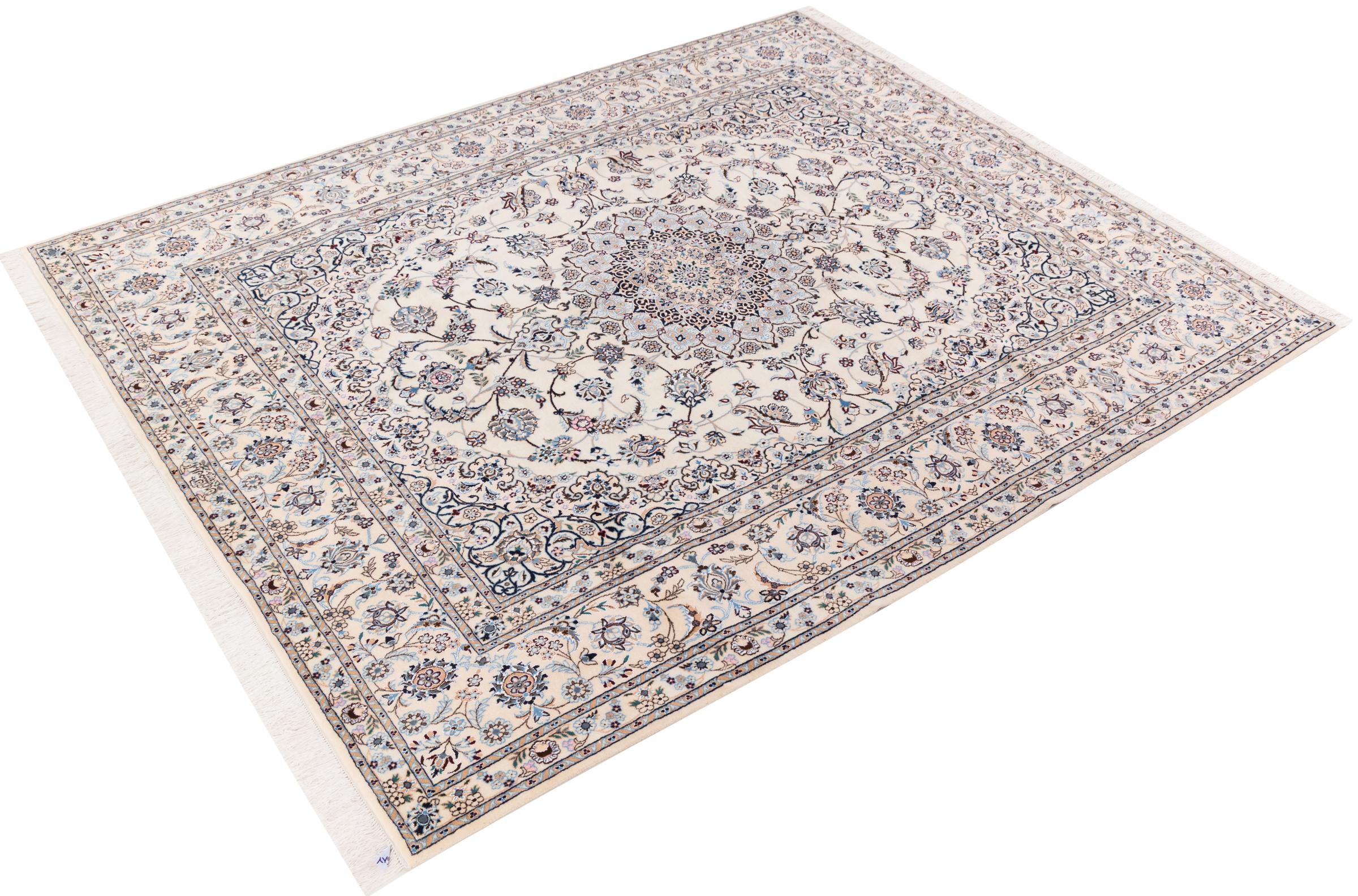 Nr.dywanu: 3069140021715 Wielkość: 265x207 cm Grubość: ok. 6 mm Gęstość tkania: 810 000 / m² Przetwarzanie: Ręcznie tkane Włosie: Wełna z jedwabiem Osnowa: Bawełna Pochodzenie: Persja / Iran Wiek: nowe Waga: ok. 14 kg Ilość w magazynie: Unikalny - Tylko 1 na składzie