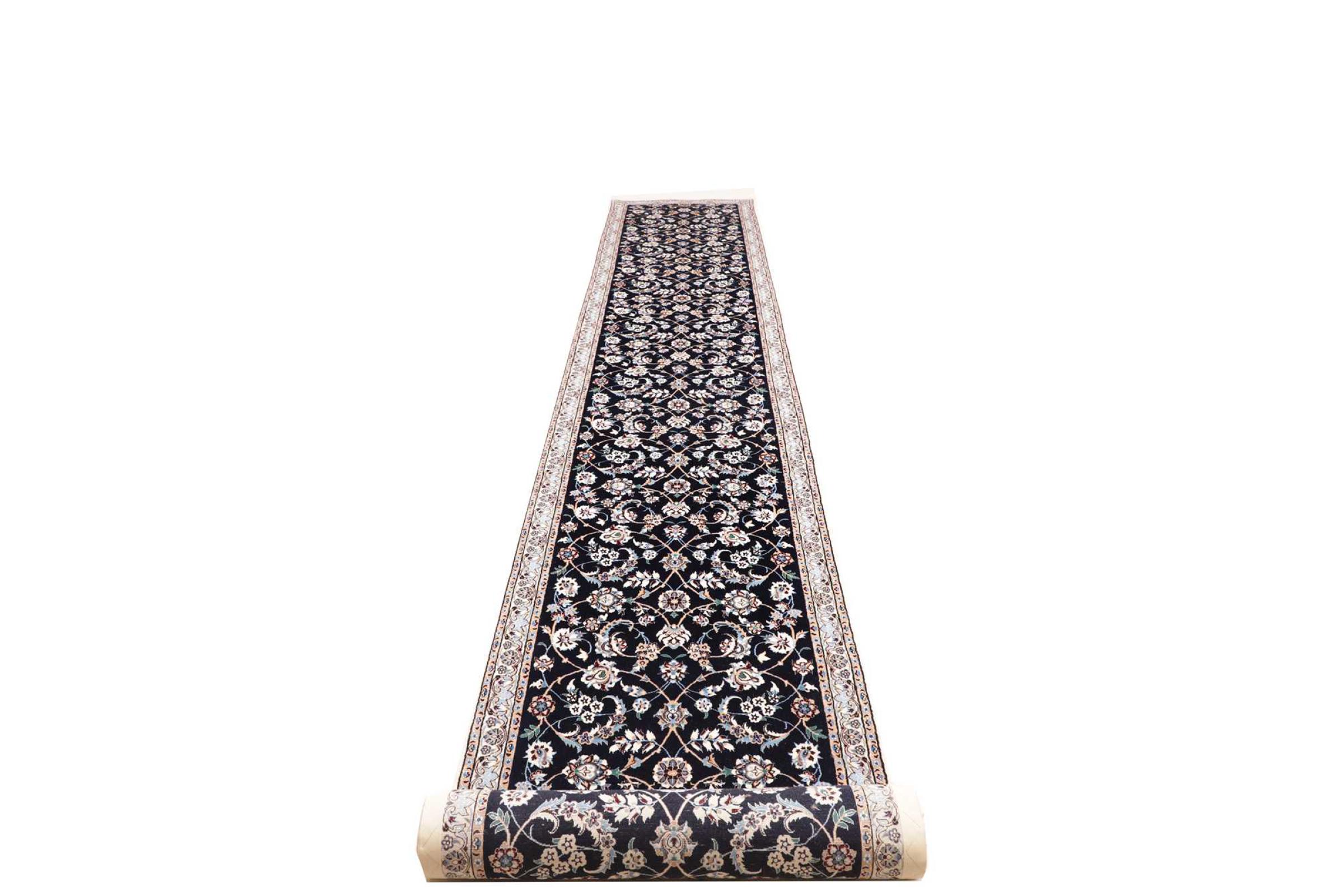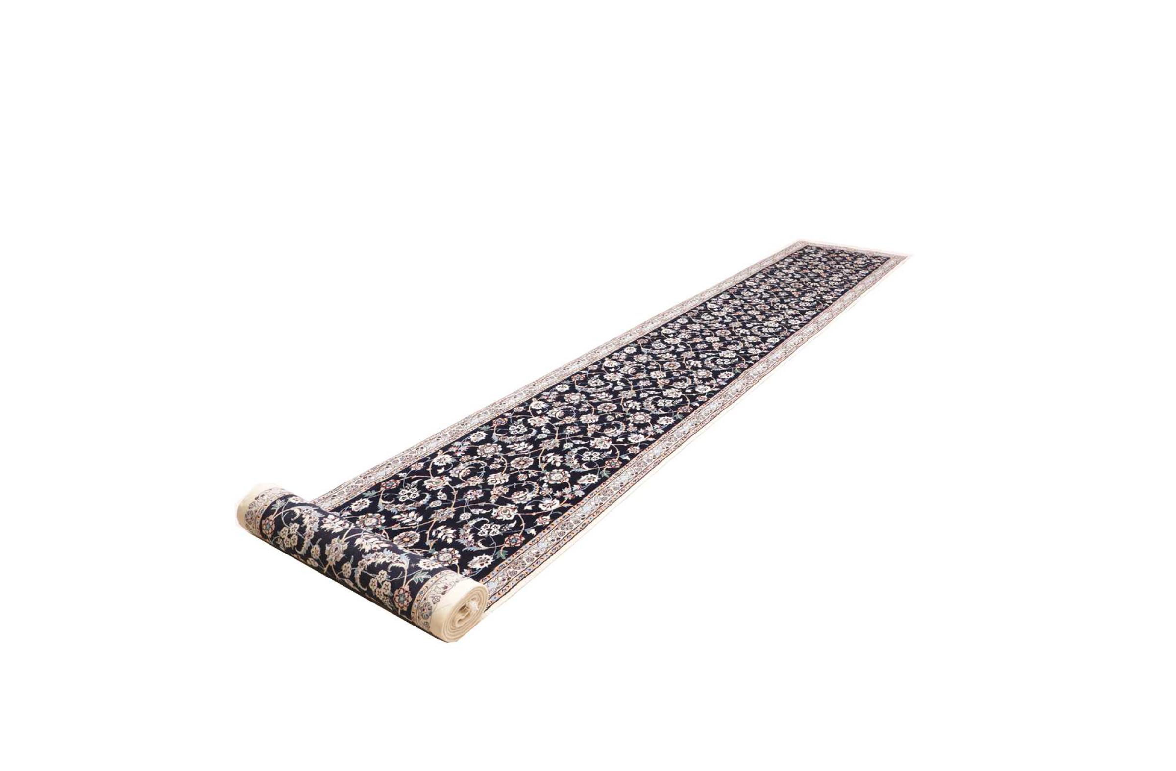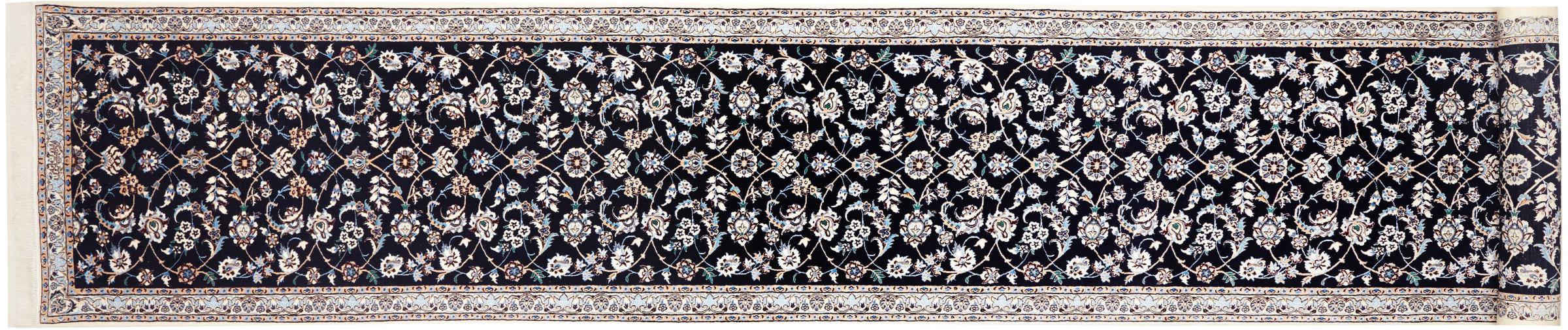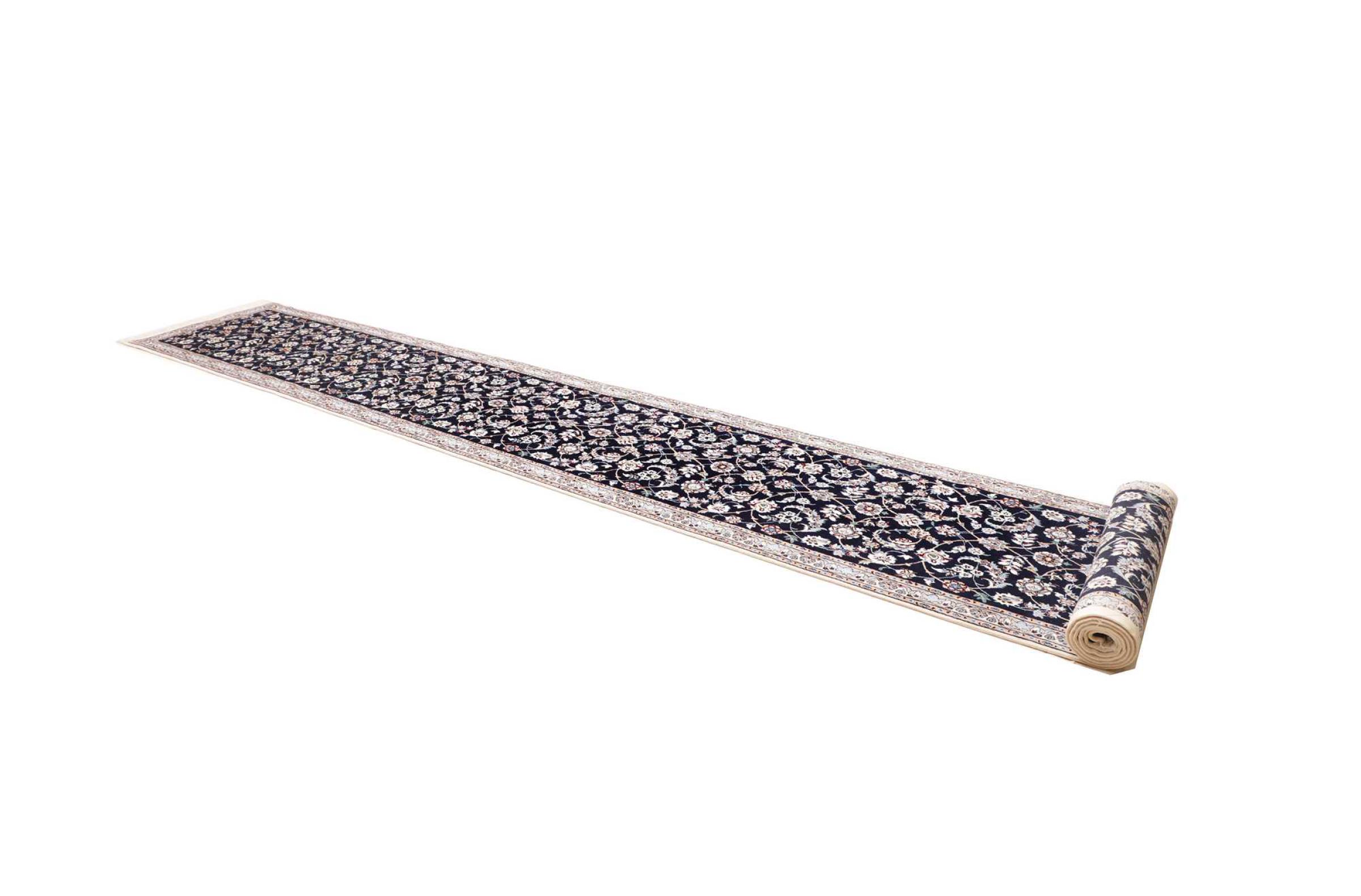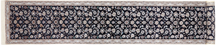 Nr.dywanu: 300790002696935 Wielkość: 613x84 cm Grubość: ok. 6 mm Gęstość tkania: 680 000 - 850 000 / m² Przetwarzanie: Ręcznie tkane Włosie: Wełna z jedwabiem Osnowa: Bawełna Pochodzenie: Persja / Iran Wiek: nowe Waga: ok. 13 kg Ilość w magazynie: Unikalny - Tylko 1 na składzie