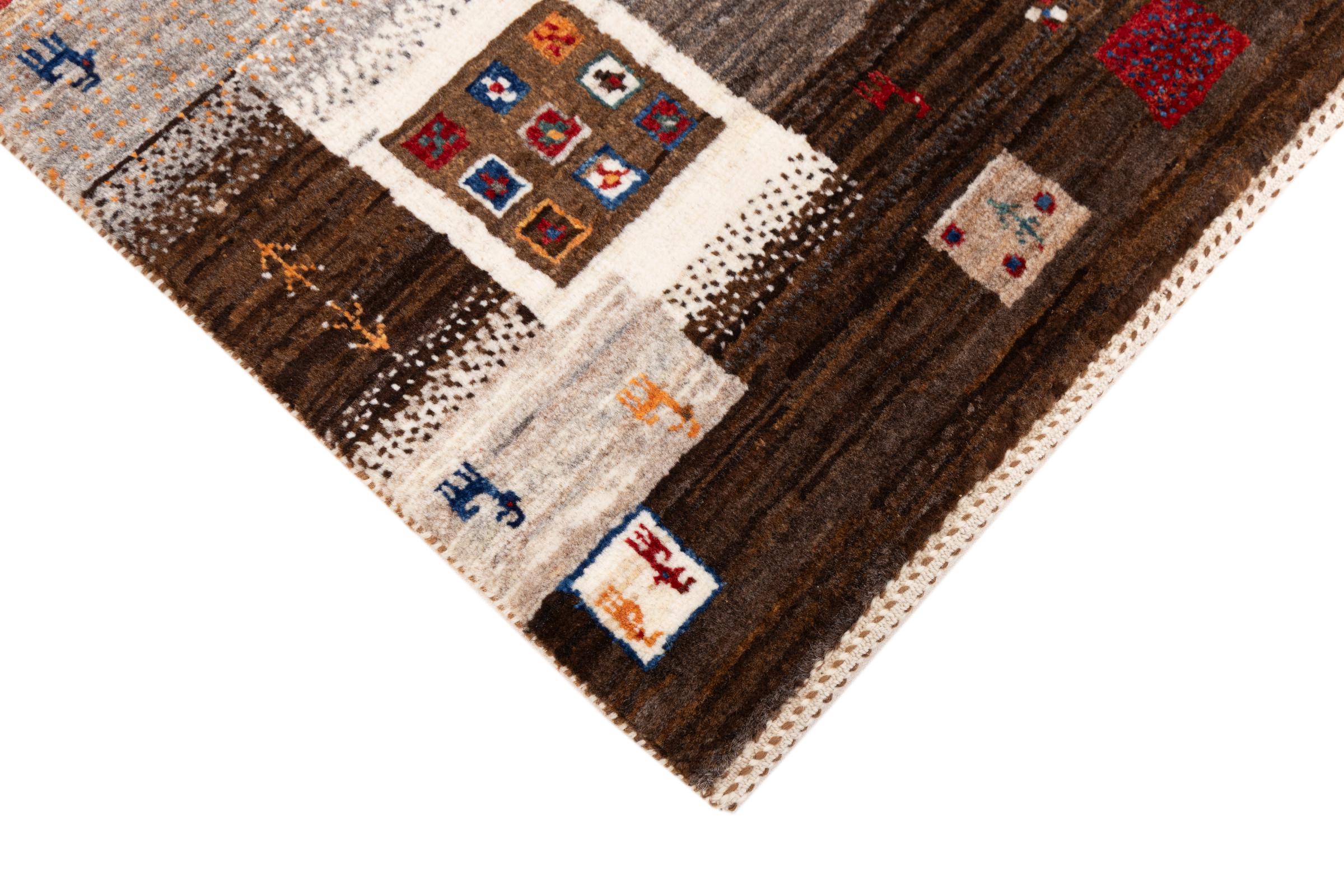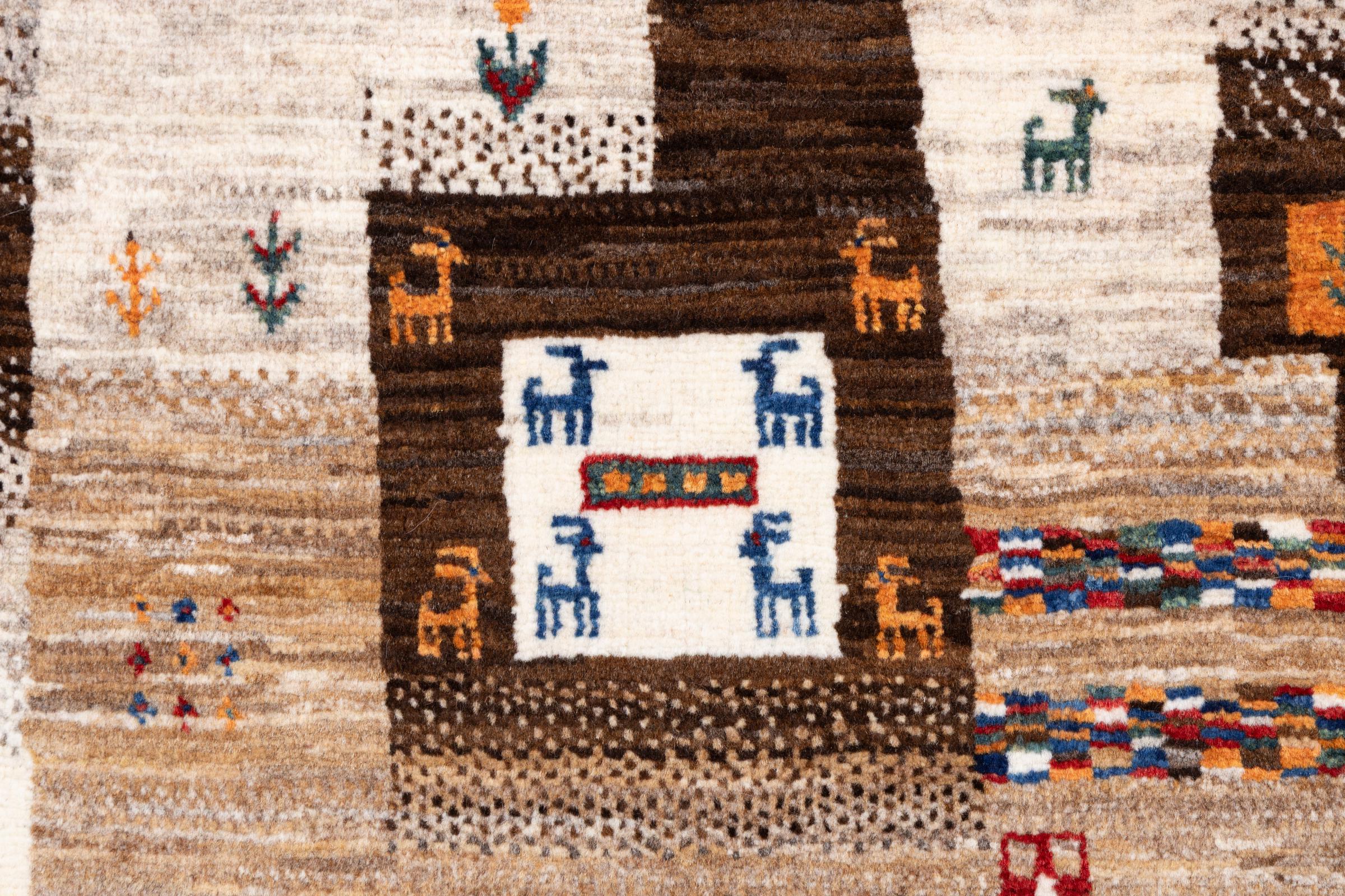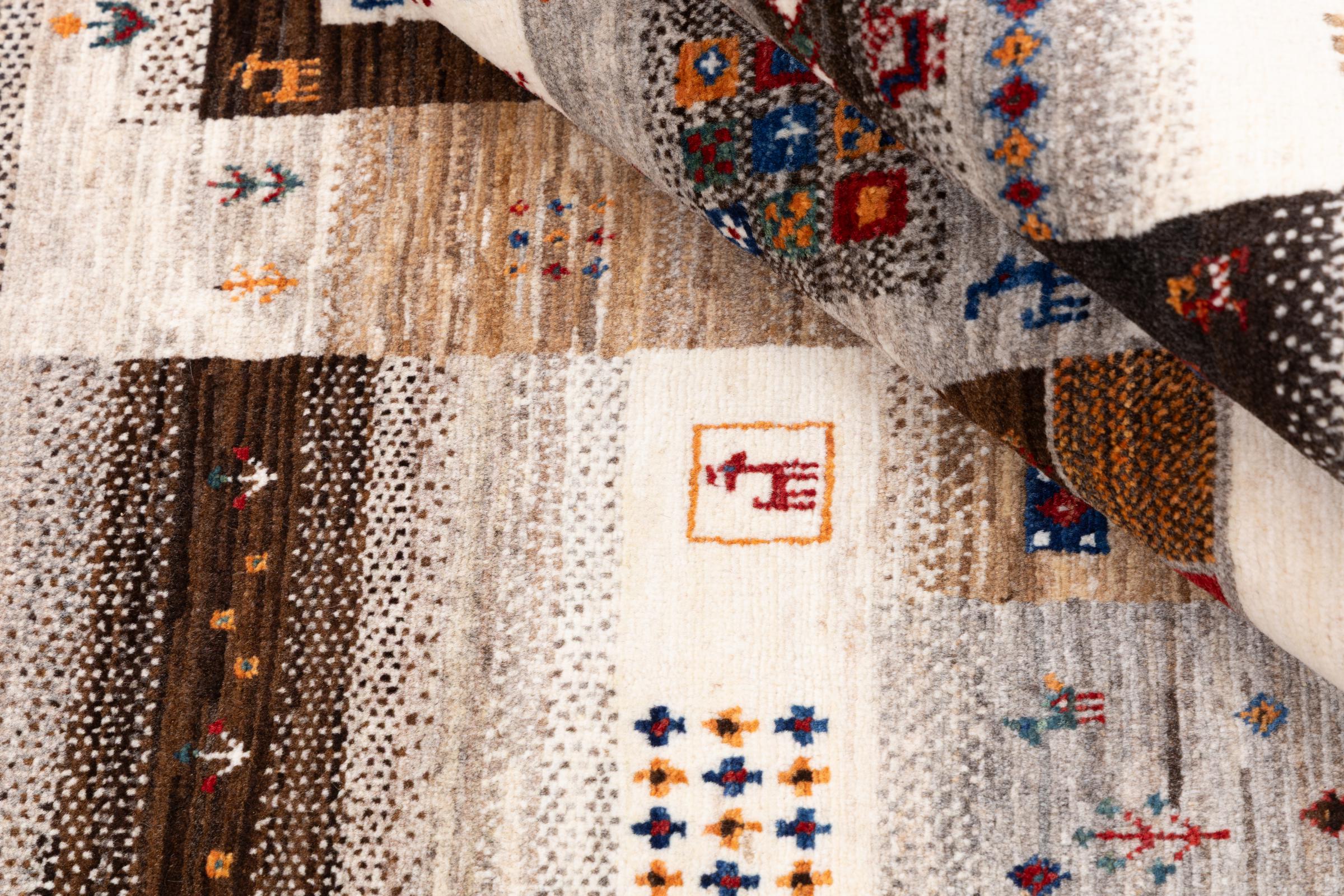 Ten piękny dywan jest perskim Gabbeh i dlatego należy do najwyższej jakości dywanów Gabbeh. Dywany są wiązane przez nomadów lub pół-nomadzi w Iranie zgodnie z tradycyjnym rzemiosłem. Proste motywy i wzory są w większości inspirowane bezpośrednim otoczeniem nomadów. Na przykład wielbłądy, drzewa lub krzewy można znaleźć na tradycyjnych dywanach. Perskie dywany Gabbeh wykonane są z wełny pochodzącej z lokalnie hodowanych stad owiec. Wełna jest więc w większości przypadków nadal obracana ręcznie. Tak więc każdy z tych orientalnych dywanów uosabia unikalny charakter wielowiekowej kultury.