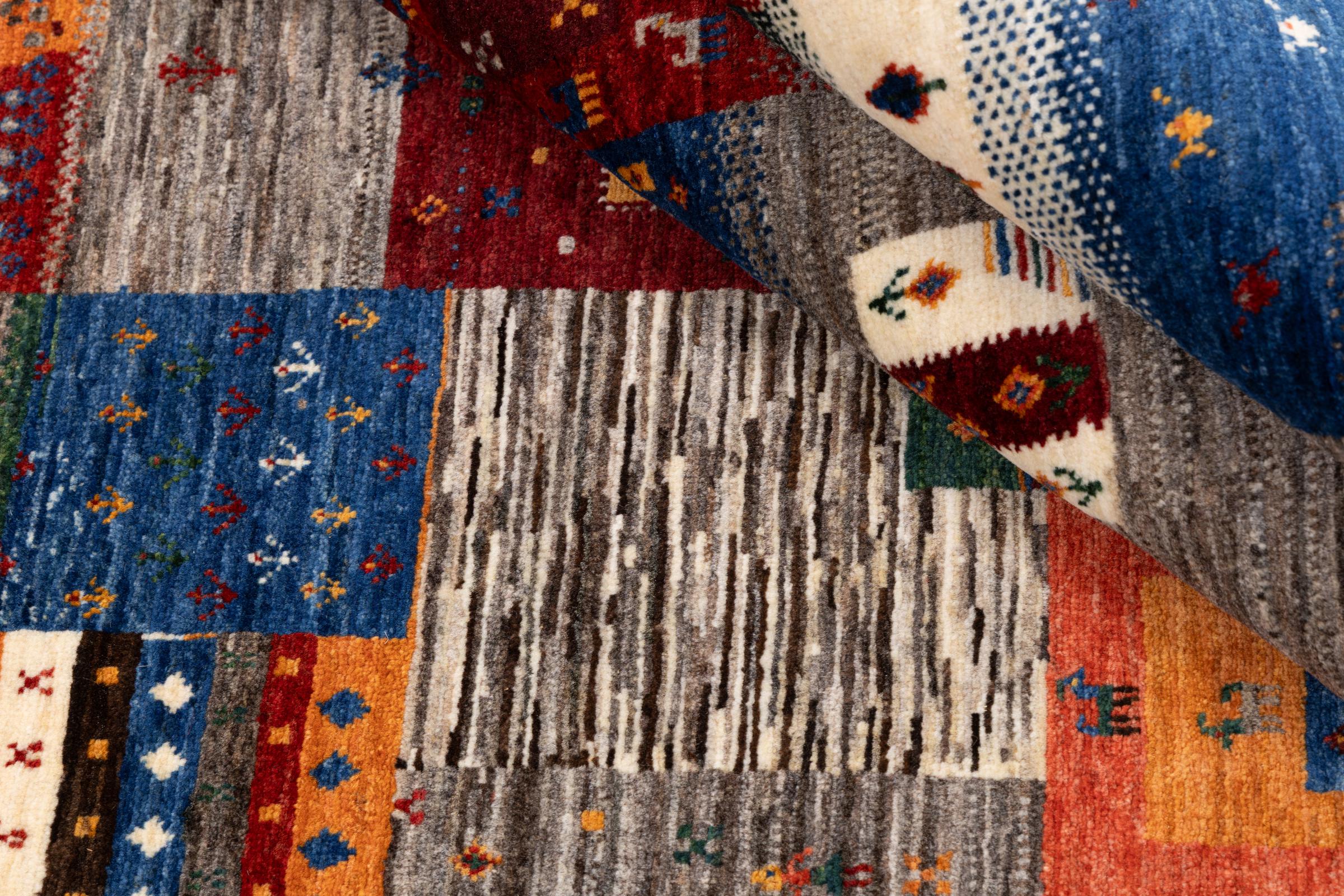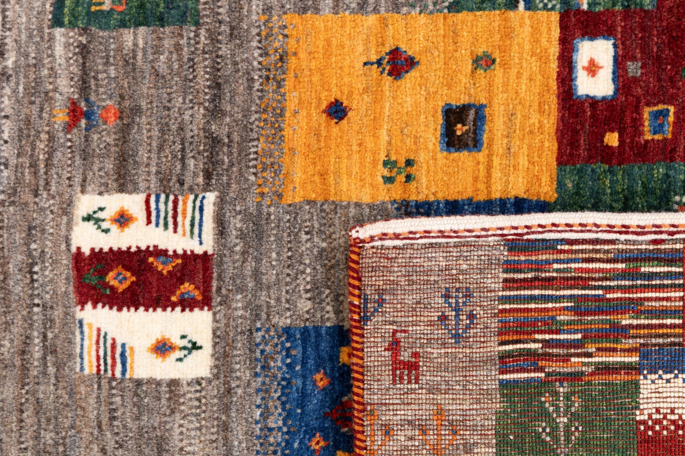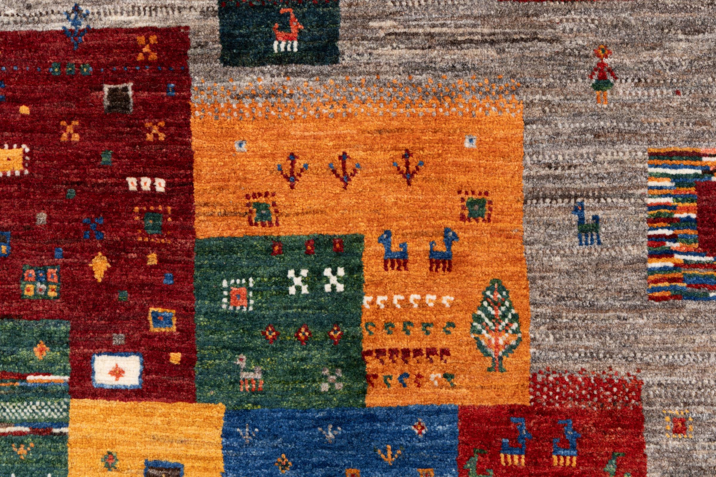Ten piękny dywan jest perskim Gabbeh i dlatego należy do najwyższej jakości dywanów Gabbeh. Dywany są wiązane przez nomadów lub pół-nomadzi w Iranie zgodnie z tradycyjnym rzemiosłem. Proste motywy i wzory są w większości inspirowane bezpośrednim otoczeniem nomadów. Na przykład wielbłądy, drzewa lub krzewy można znaleźć na tradycyjnych dywanach. Perskie dywany Gabbeh wykonane są z wełny pochodzącej z lokalnie hodowanych stad owiec. Wełna jest więc w większości przypadków nadal obracana ręcznie. Tak więc każdy z tych orientalnych dywanów uosabia unikalny charakter wielowiekowej kultury.