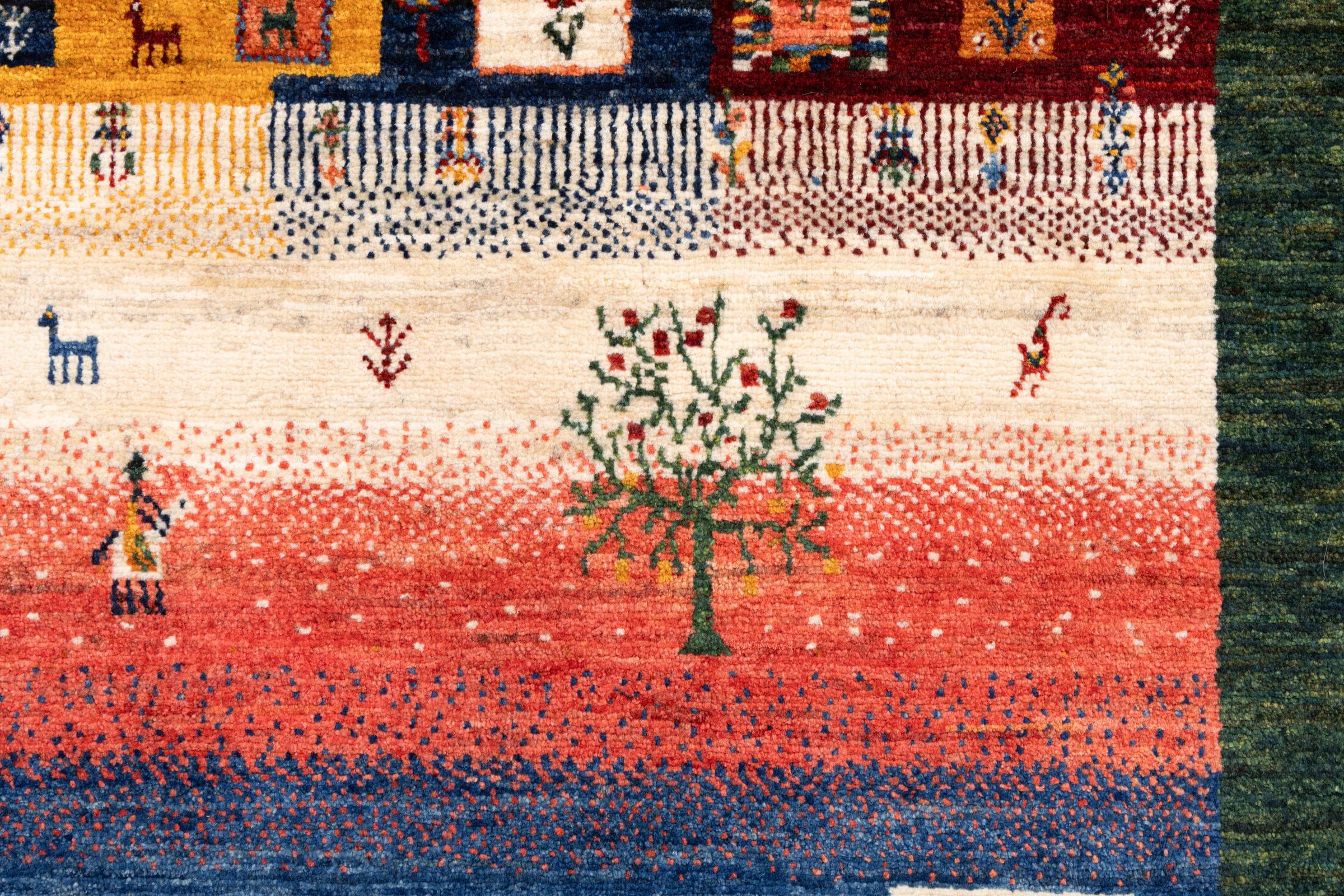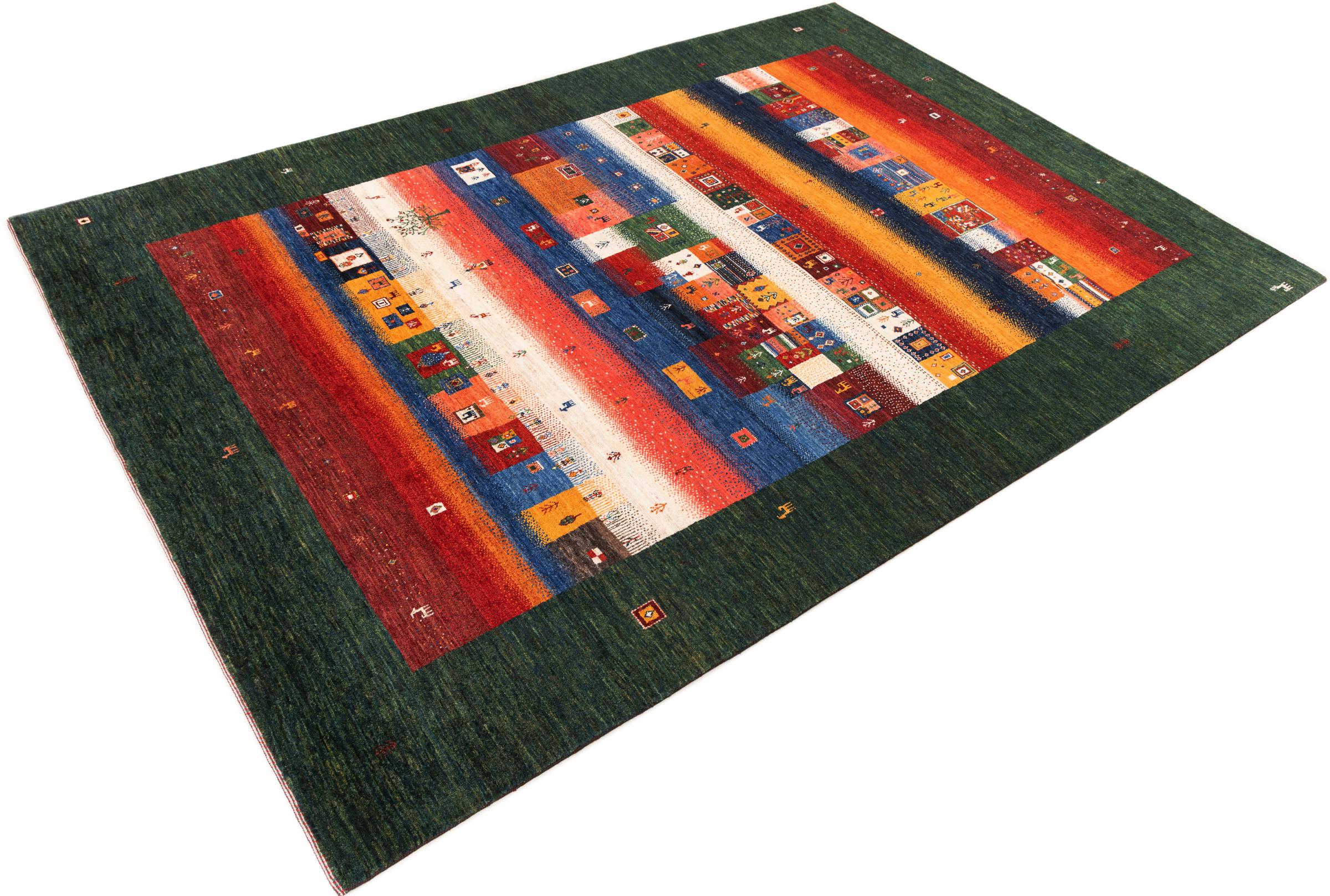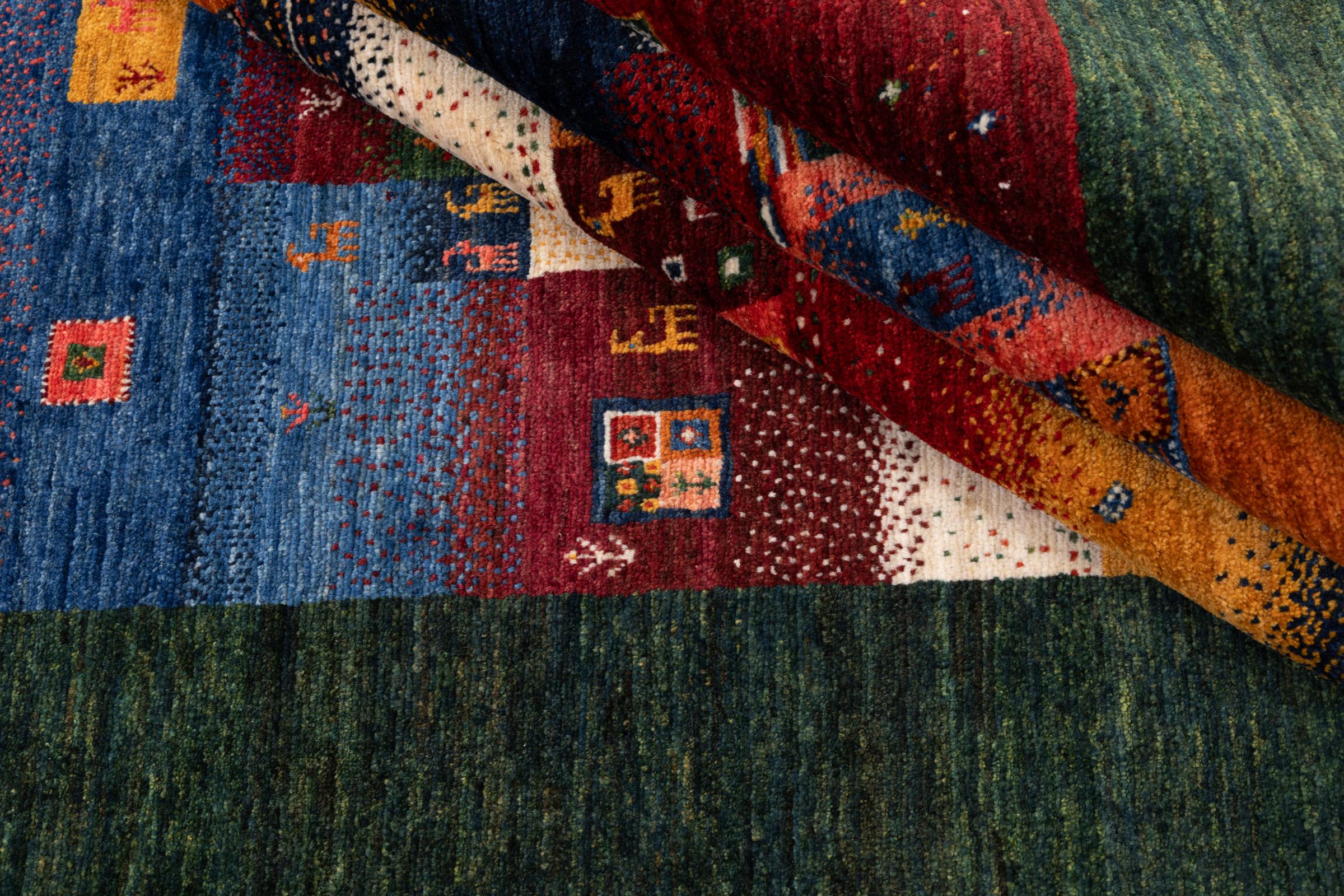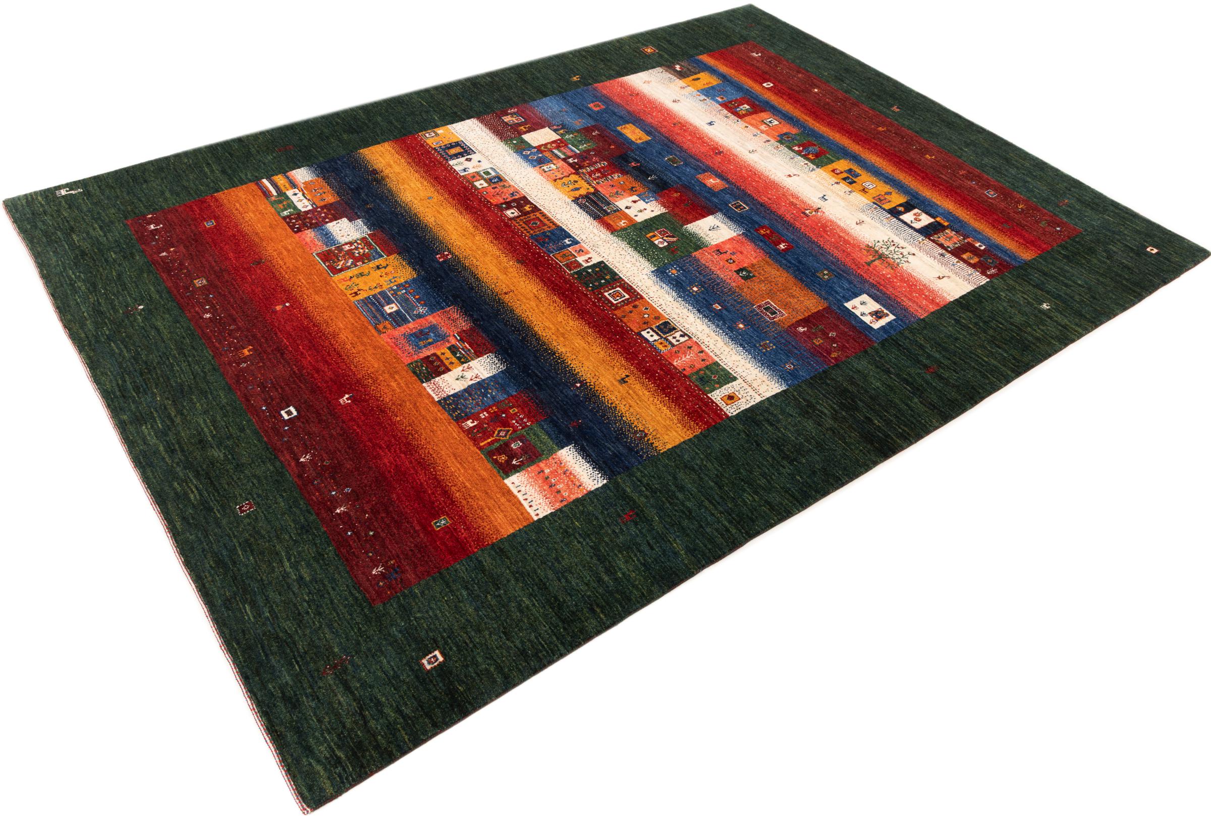 Ten piękny dywan jest perskim Gabbeh i dlatego należy do najwyższej jakości dywanów Gabbeh. Dywany są wiązane przez nomadów lub pół-nomadzi w Iranie zgodnie z tradycyjnym rzemiosłem. Proste motywy i wzory są w większości inspirowane bezpośrednim otoczeniem nomadów. Na przykład wielbłądy, drzewa lub krzewy można znaleźć na tradycyjnych dywanach. Perskie dywany Gabbeh wykonane są z wełny pochodzącej z lokalnie hodowanych stad owiec. Wełna jest więc w większości przypadków nadal obracana ręcznie. Tak więc każdy z tych orientalnych dywanów uosabia unikalny charakter wielowiekowej kultury.