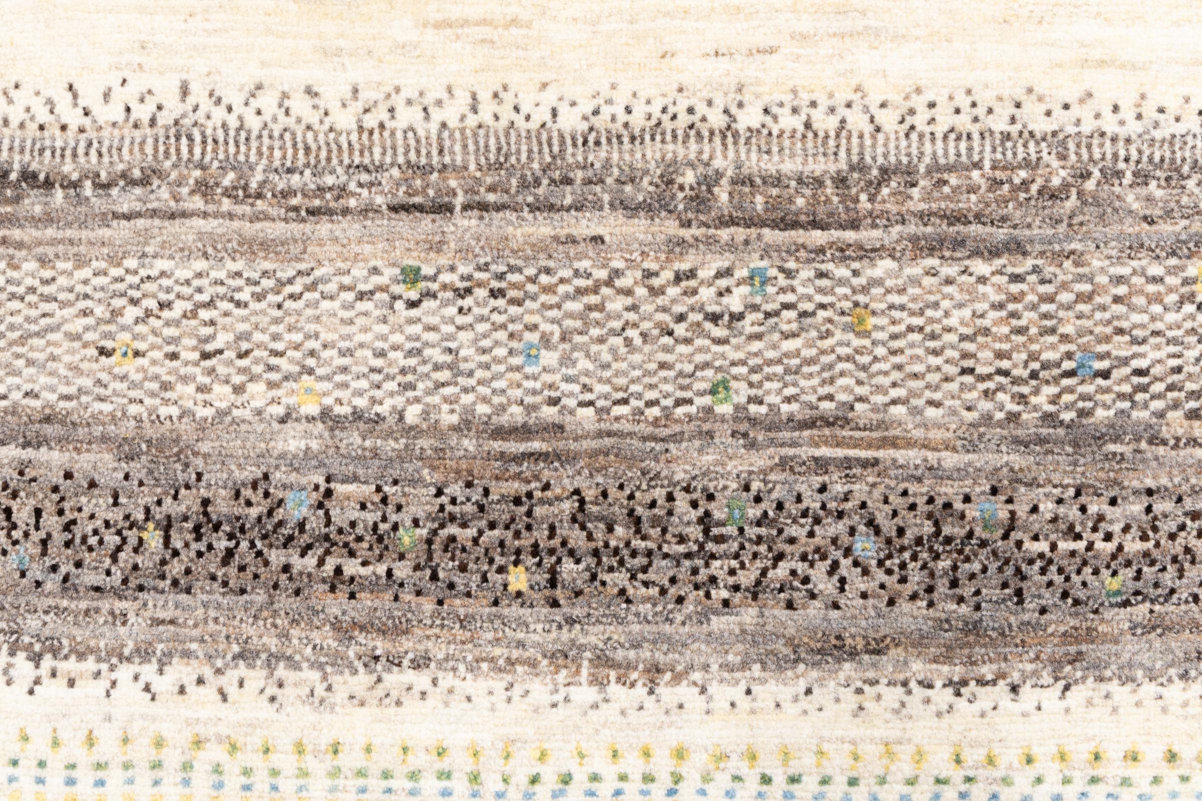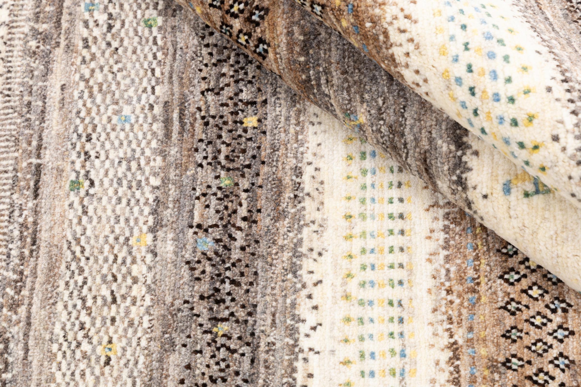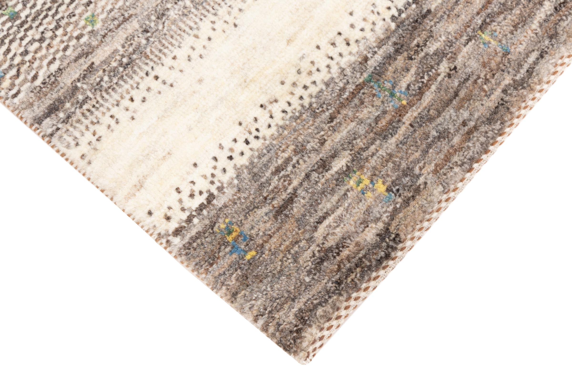 Ten piękny dywan jest perskim Gabbeh i dlatego należy do najwyższej jakości dywanów Gabbeh. Dywany są wiązane przez nomadów lub pół-nomadzi w Iranie zgodnie z tradycyjnym rzemiosłem. Proste motywy i wzory są w większości inspirowane bezpośrednim otoczeniem nomadów. Na przykład wielbłądy, drzewa lub krzewy można znaleźć na tradycyjnych dywanach. Perskie dywany Gabbeh wykonane są z wełny pochodzącej z lokalnie hodowanych stad owiec. Wełna jest więc w większości przypadków nadal obracana ręcznie. Tak więc każdy z tych orientalnych dywanów uosabia unikalny charakter wielowiekowej kultury.