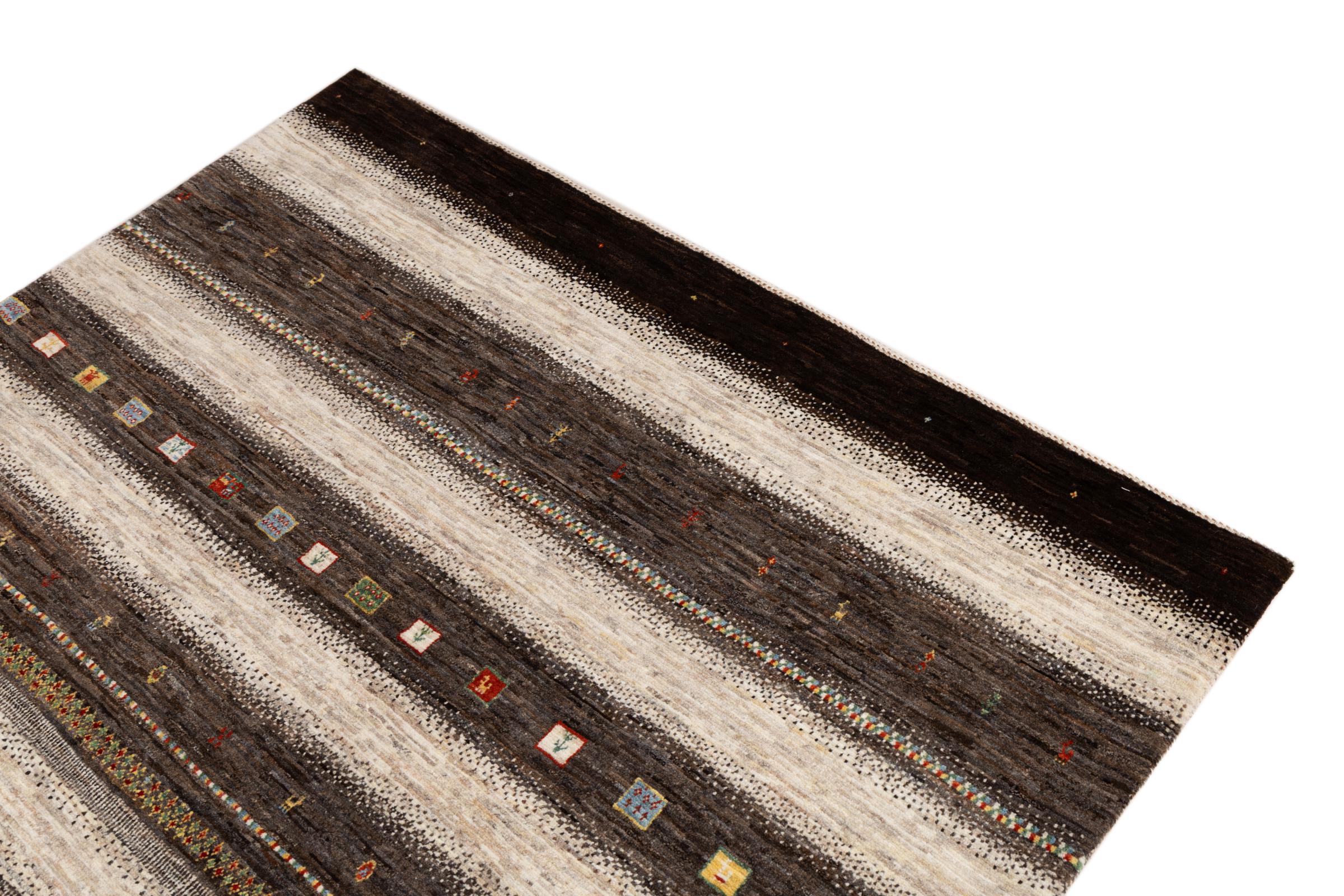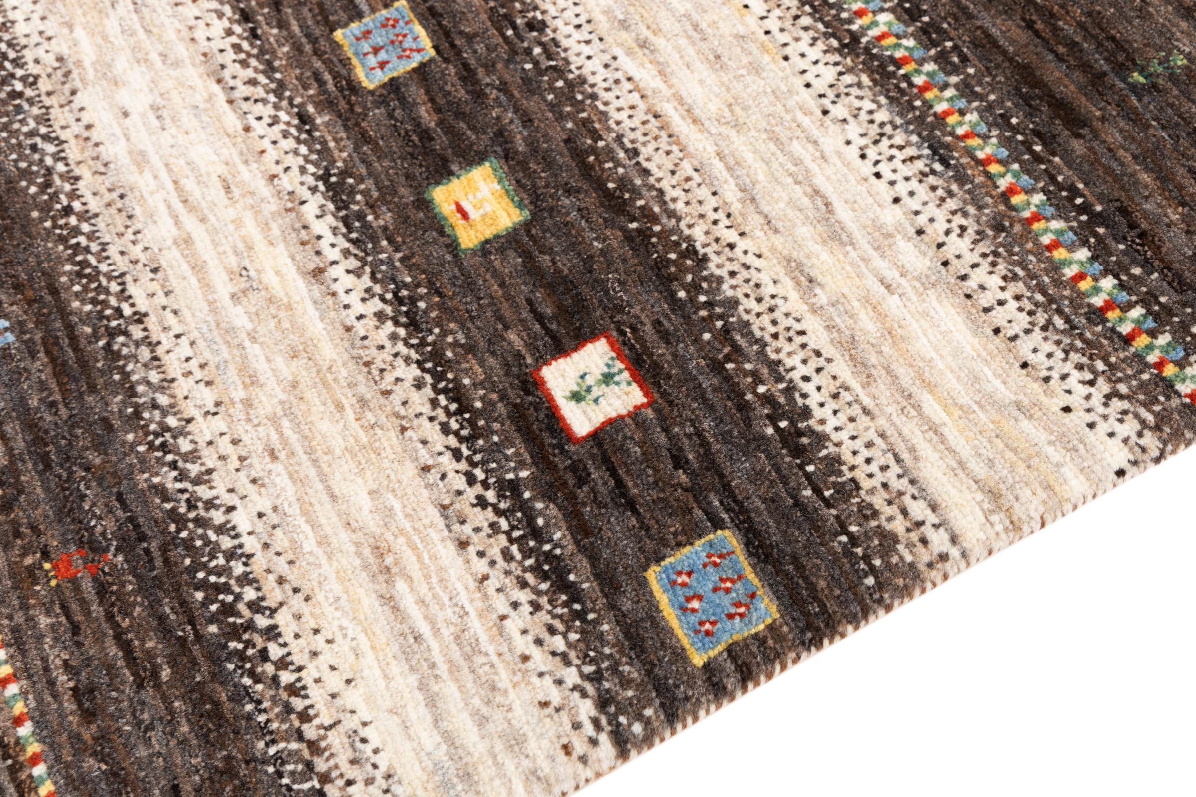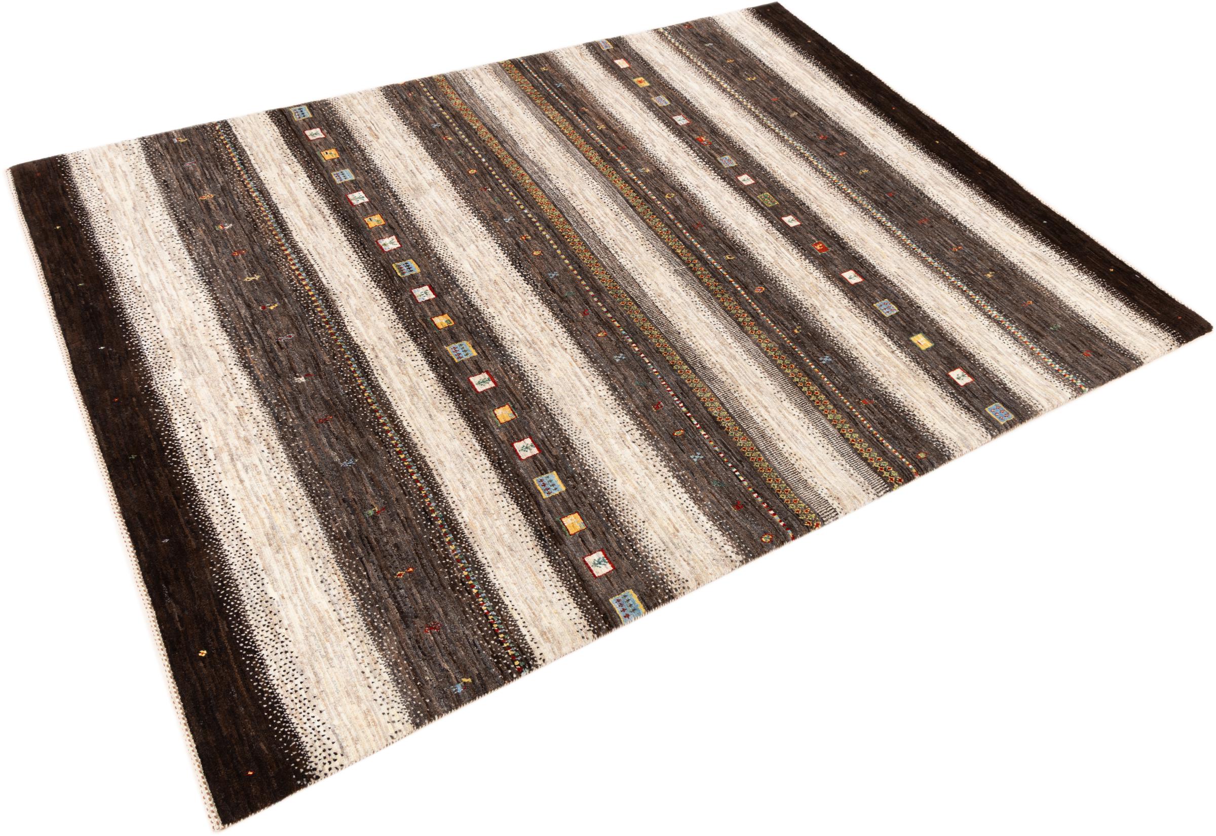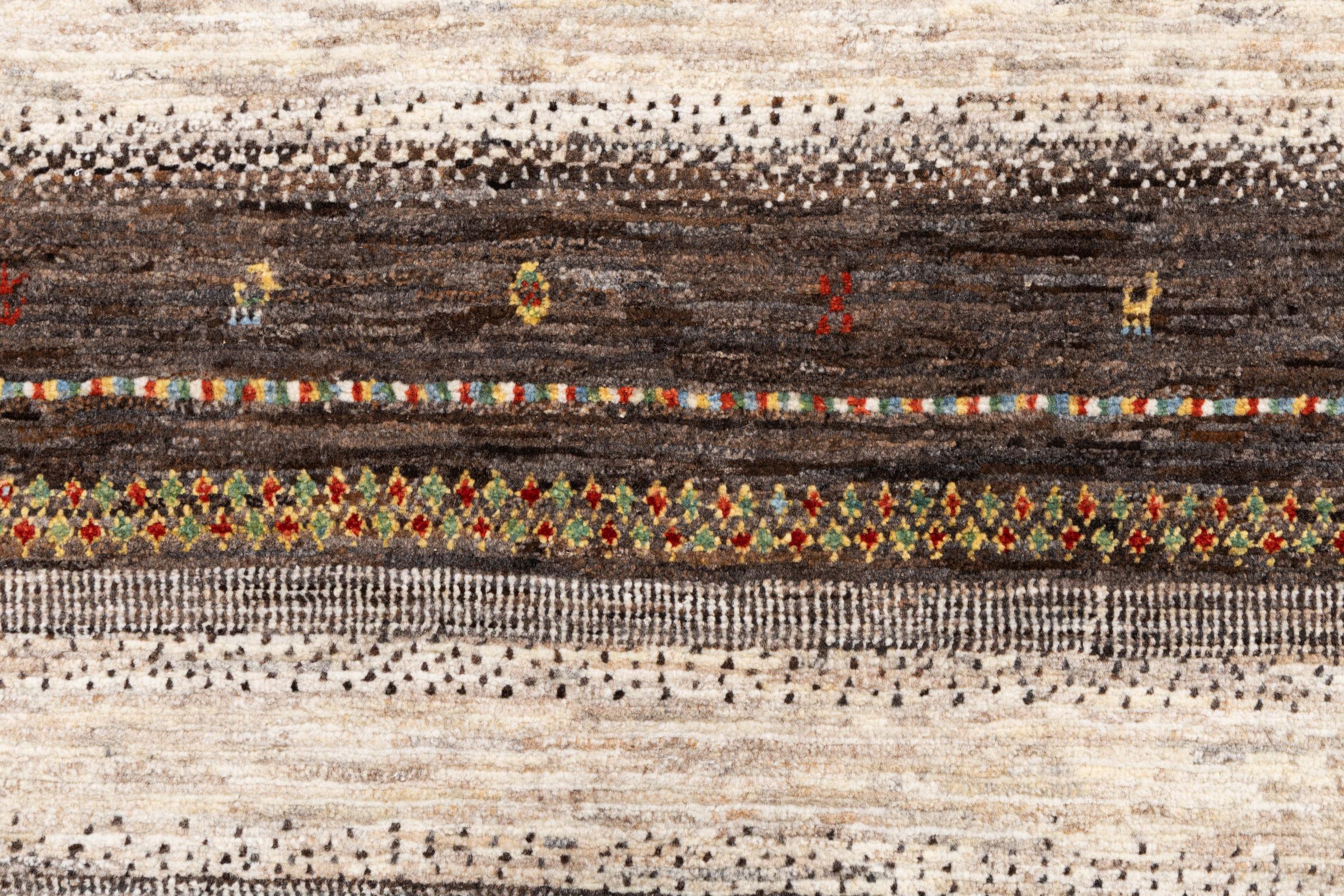 Ten piękny dywan jest perskim Gabbeh i dlatego należy do najwyższej jakości dywanów Gabbeh. Dywany są wiązane przez nomadów lub pół-nomadzi w Iranie zgodnie z tradycyjnym rzemiosłem. Proste motywy i wzory są w większości inspirowane bezpośrednim otoczeniem nomadów. Na przykład wielbłądy, drzewa lub krzewy można znaleźć na tradycyjnych dywanach. Perskie dywany Gabbeh wykonane są z wełny pochodzącej z lokalnie hodowanych stad owiec. Wełna jest więc w większości przypadków nadal obracana ręcznie. Tak więc każdy z tych orientalnych dywanów uosabia unikalny charakter wielowiekowej kultury.