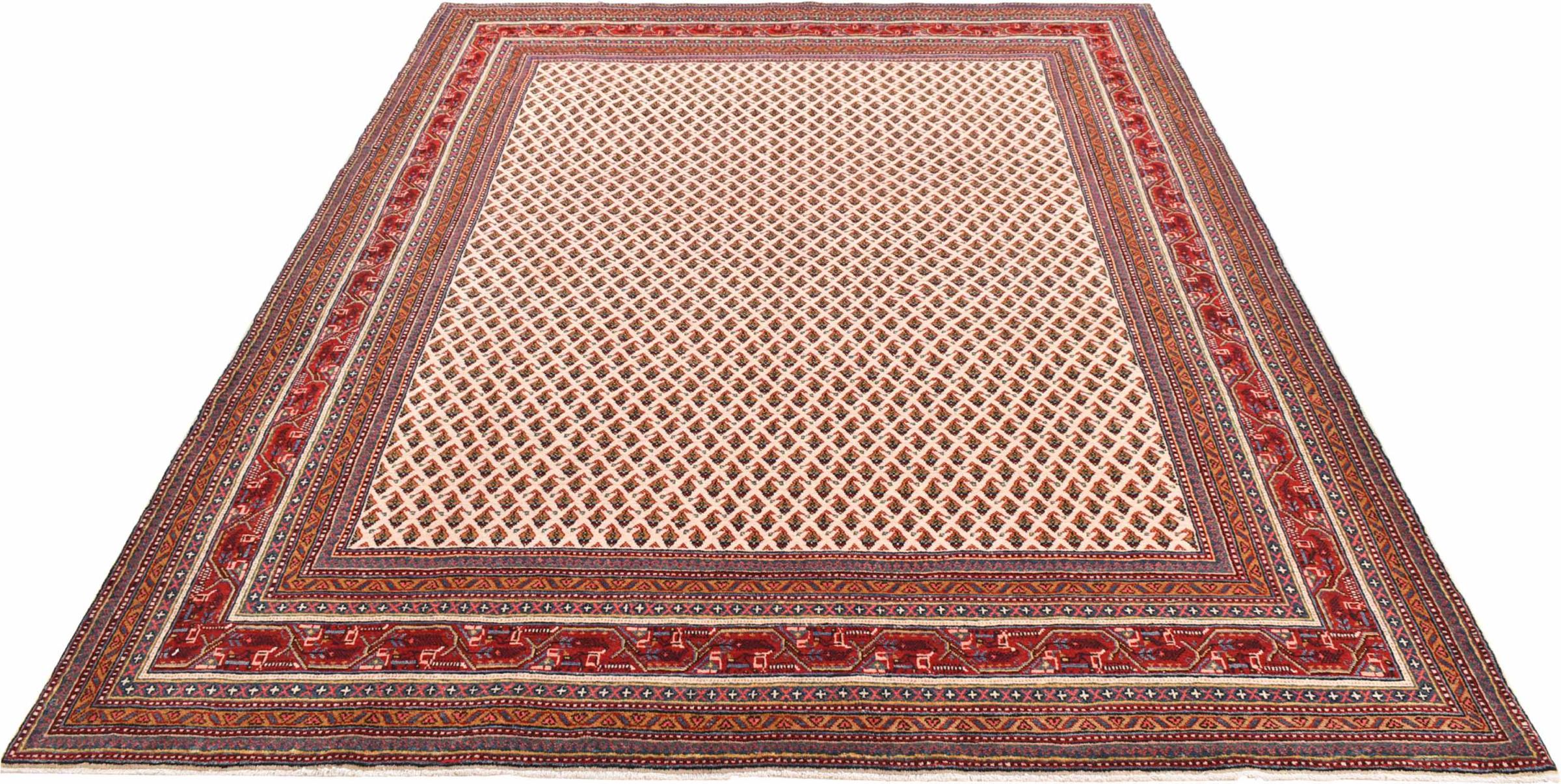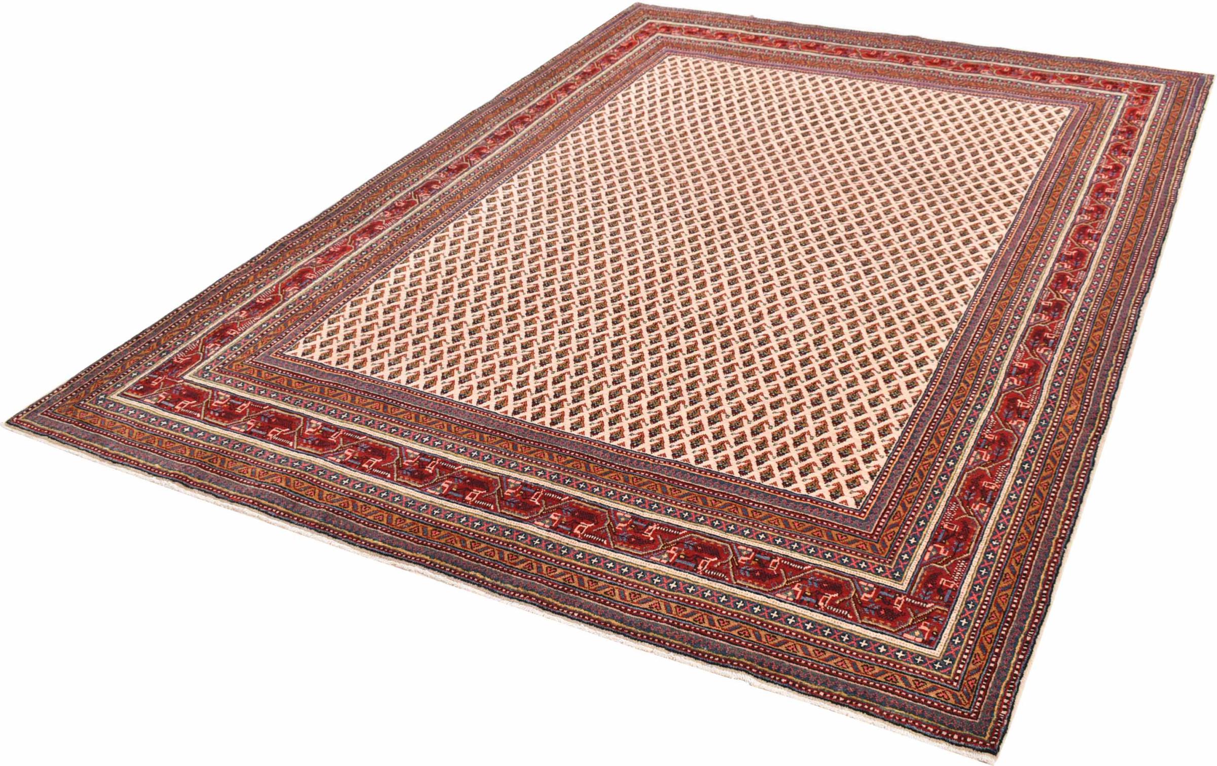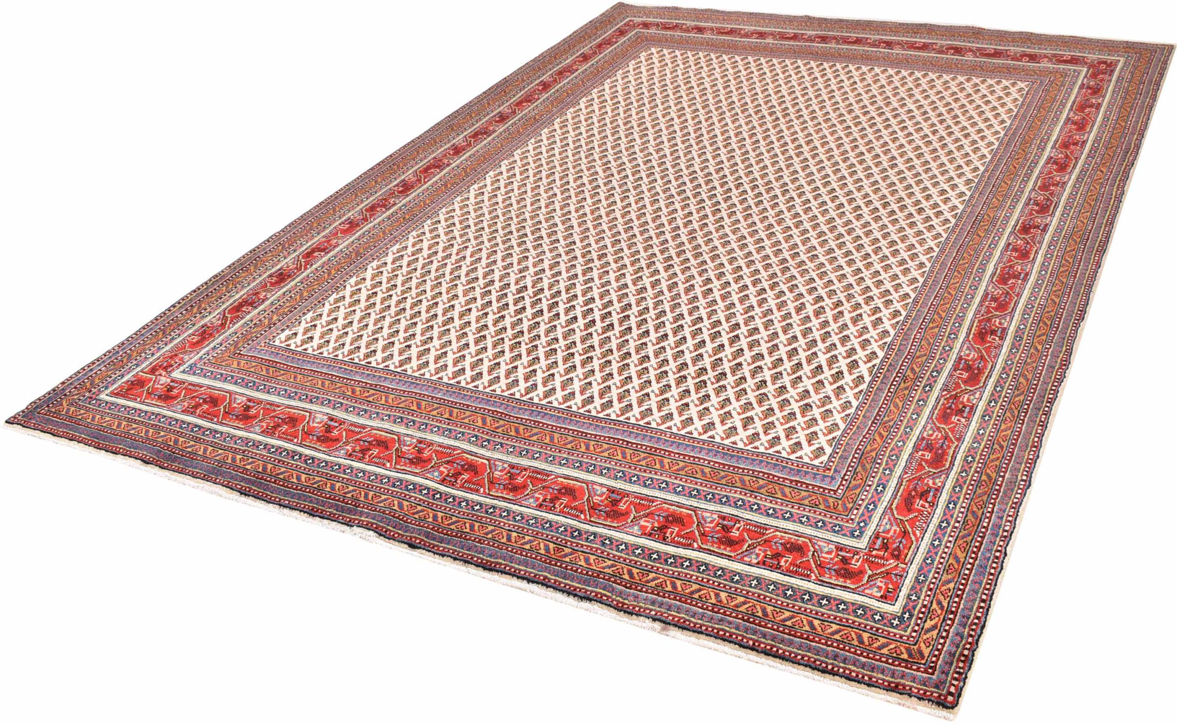 Nr.dywanu: 30981400668505 Wielkość: 313x214 cm Grubość: ok. 12 mm Gęstość tkania: 160 000 - 200 000 / m² Przetwarzanie: Ręcznie tkane Włosie: Wełna ręcznie przędzona Osnowa: Bawełna Pochodzenie: Persja / Iran Wiek: nowe Waga: ok. 27 kg Znany także jako Sarough Mir Ilość w magazynie: Unikalny - Tylko 1 na składzie