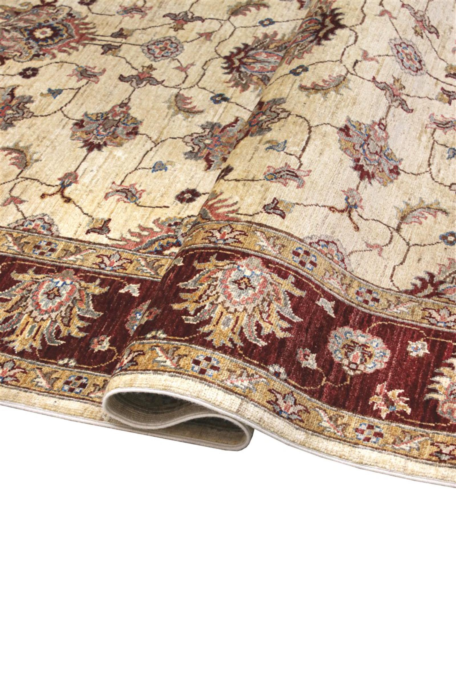 Dywan ten wykonany jest z ręcznie formowanej wełny owczej najwyższej jakości. Zwłaszcza w Iranie (była Persja), Afganistanie i Pakistanie wełna jest nadal ręcznie skręcana, zanim rozpocznie się faktyczne wiązanie dywanu. Wełna sprawdziła się jako naturalny i niezwykle wytrzymały materiał na przestrzeni wieków. Ma m.in. właściwości antybrudzące i termoizolacyjne. Jednocześnie wełna jest nieporównywalnie miękka i ma naturalny połysk.